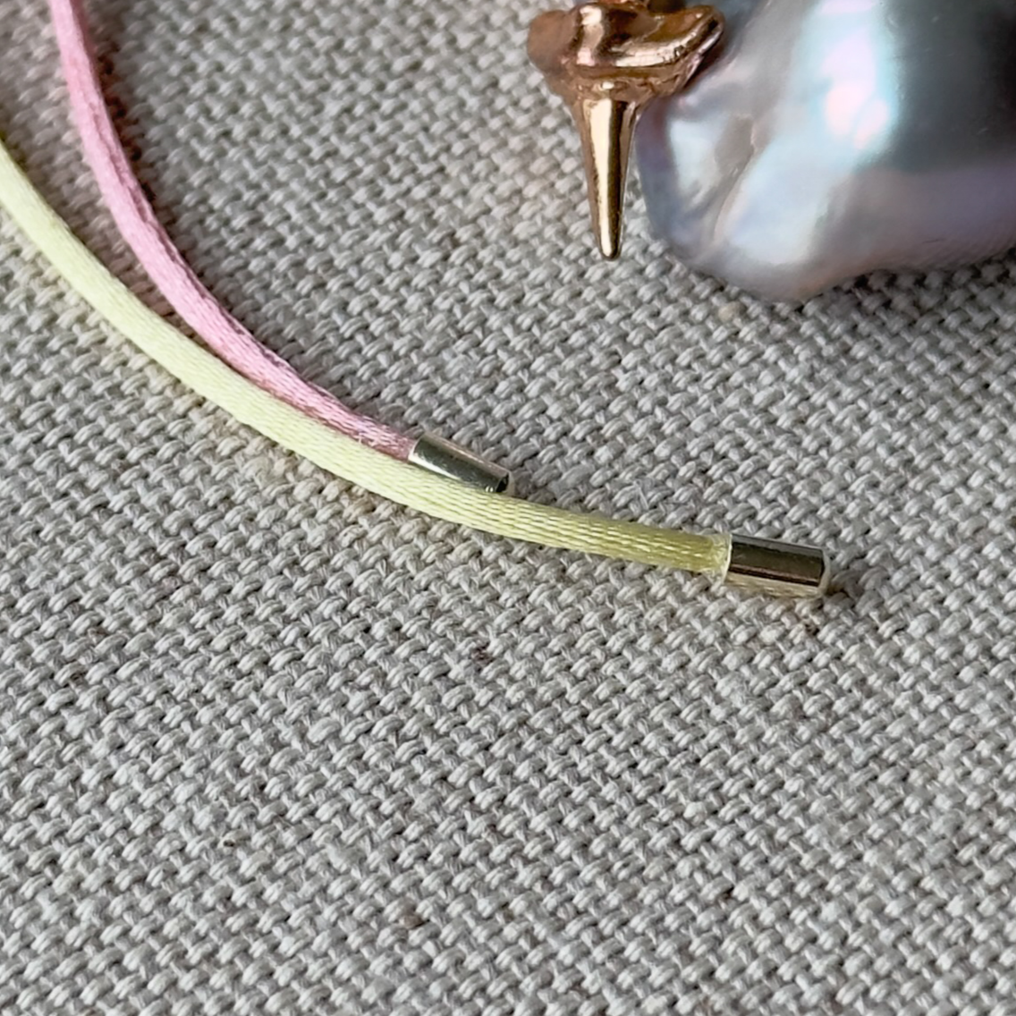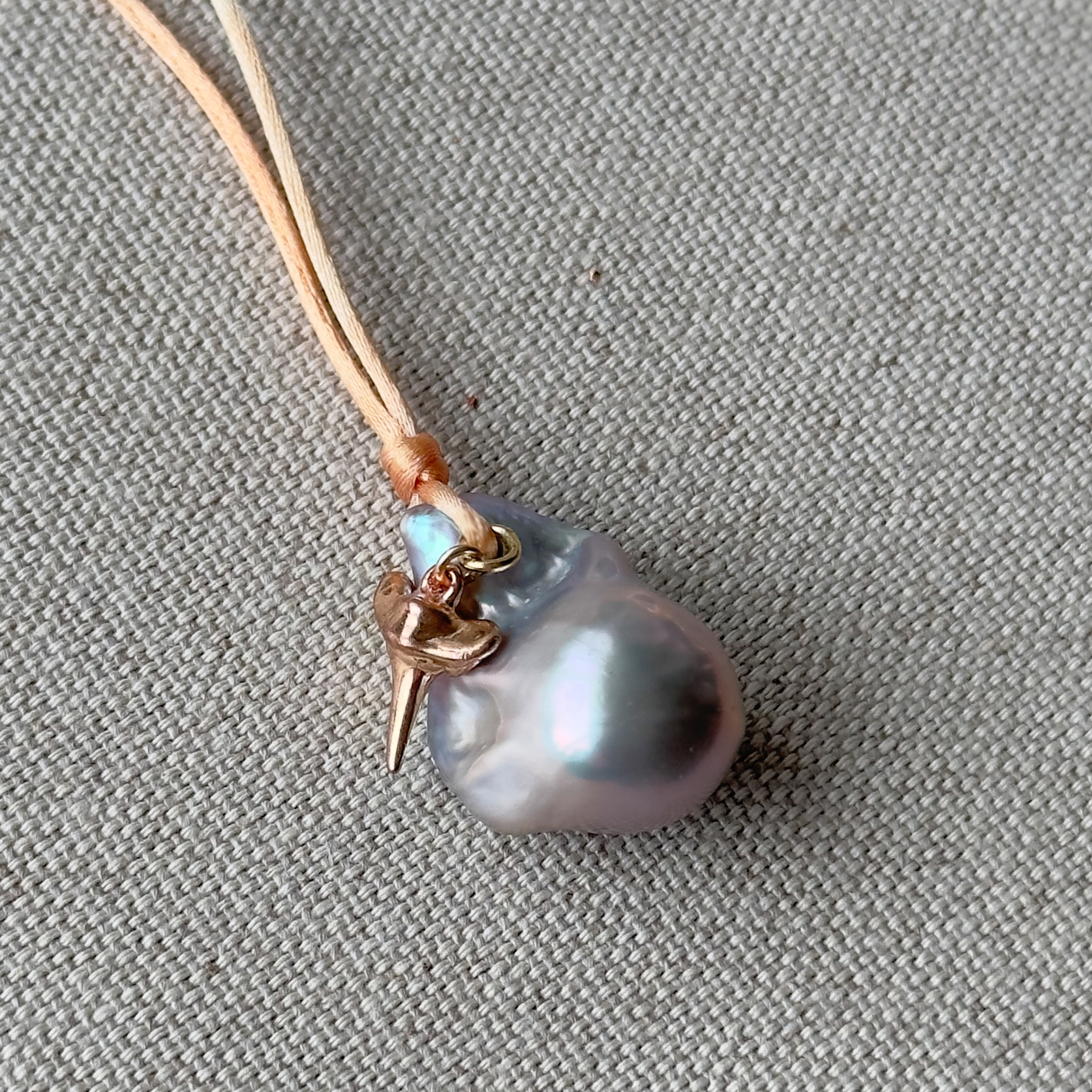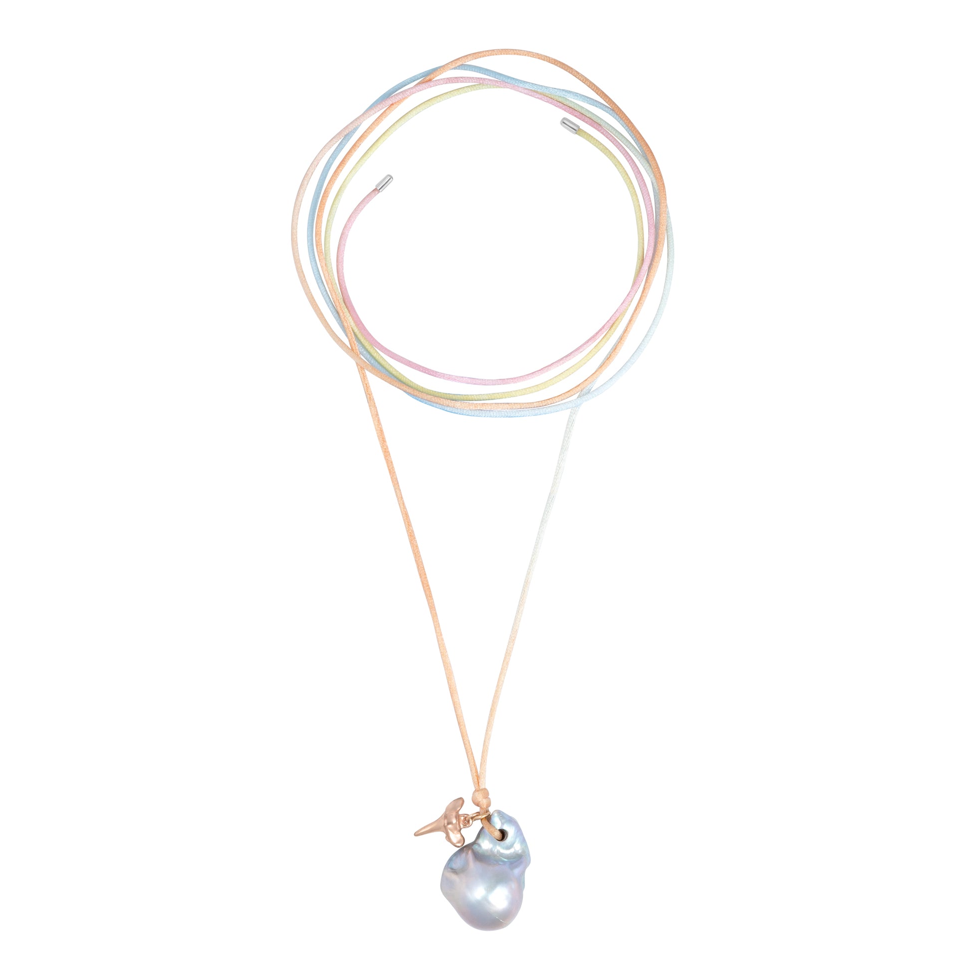 - Materials: Fireball pearl pendant, 18K rose gold vermeil shark tooth charm, ombre satin nylon cord, gold plated components