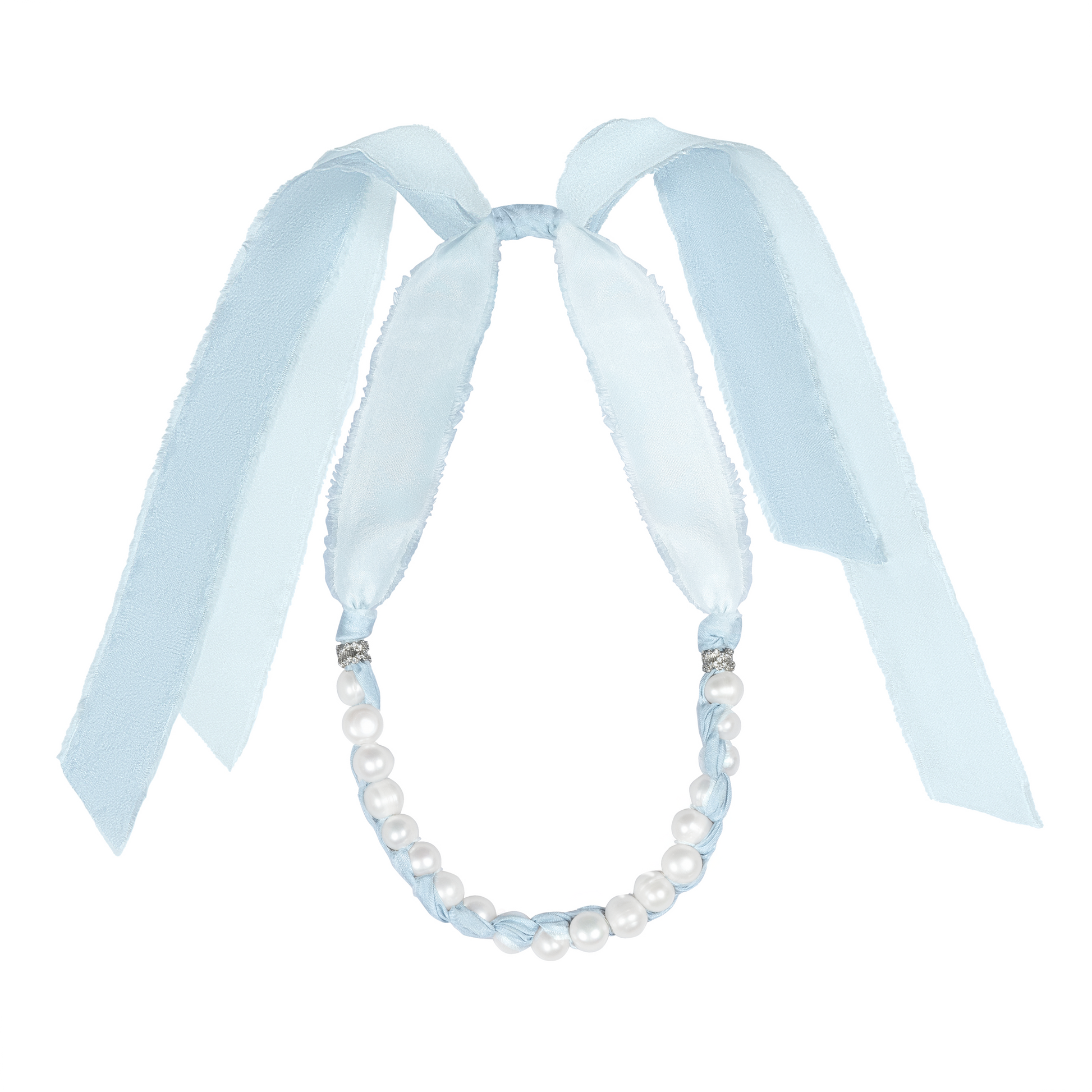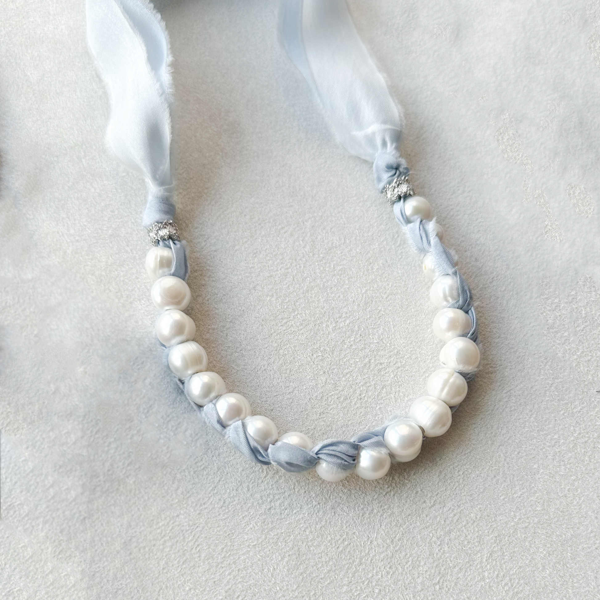 - Materials: Freshwater pearls; raw, hand-torn habotai silk ribbon; silver plated cz components