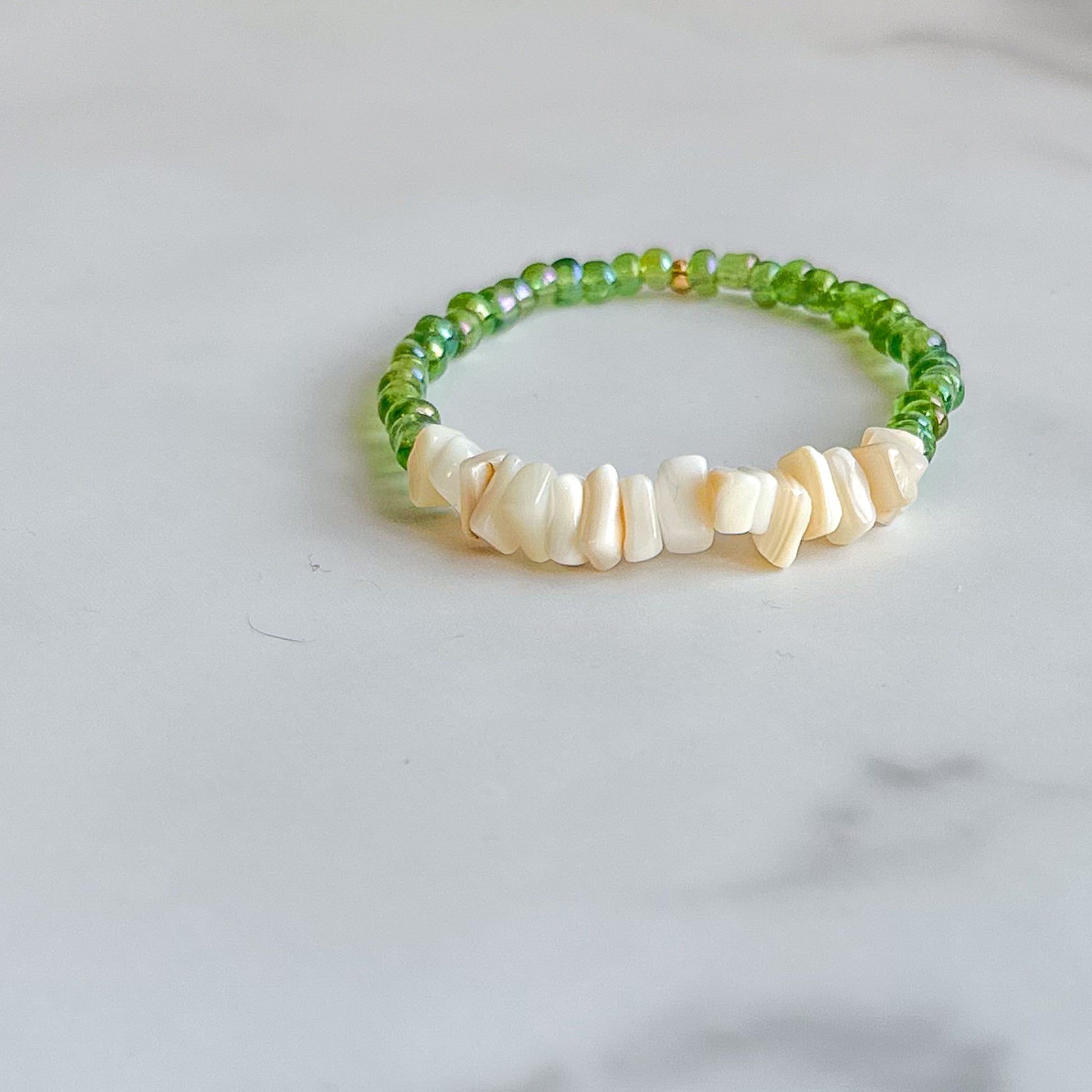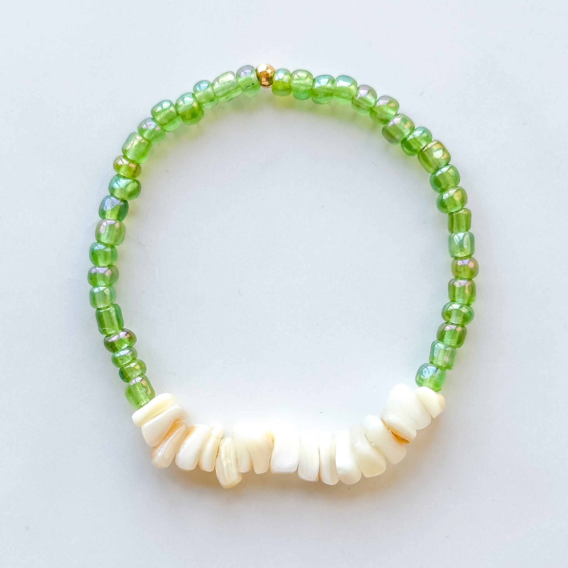 - Handmade glass seed beaded stretch bracelet, accented with a band of natural shell chips