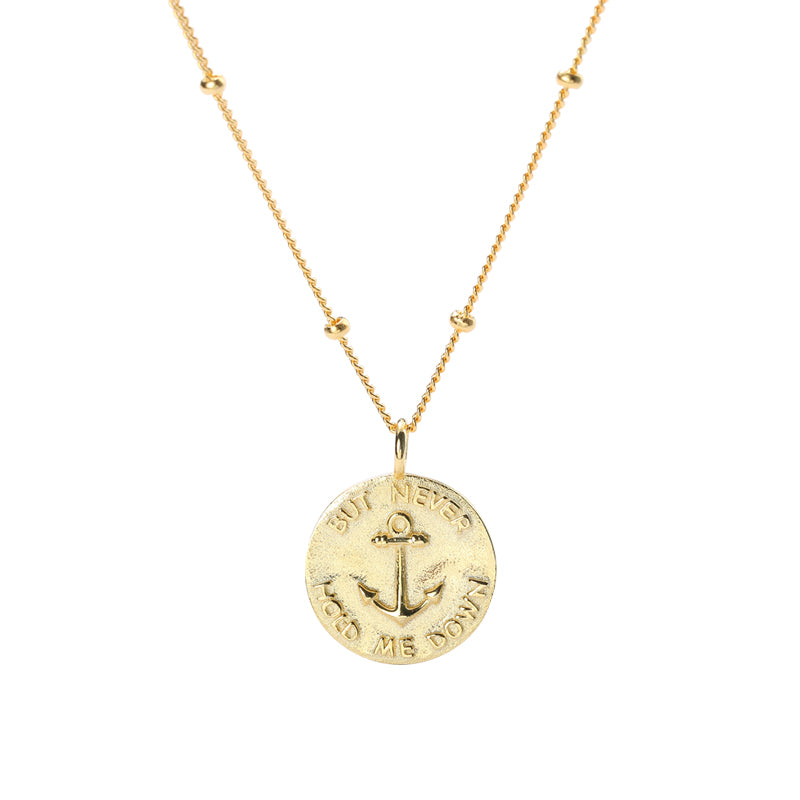 - 18K gold plated Sterling Silver necklace with anchor coin charm, inscribed on the back with "Be the One to Guide Me" and on the front with "But Never Hold Me Down" messaging