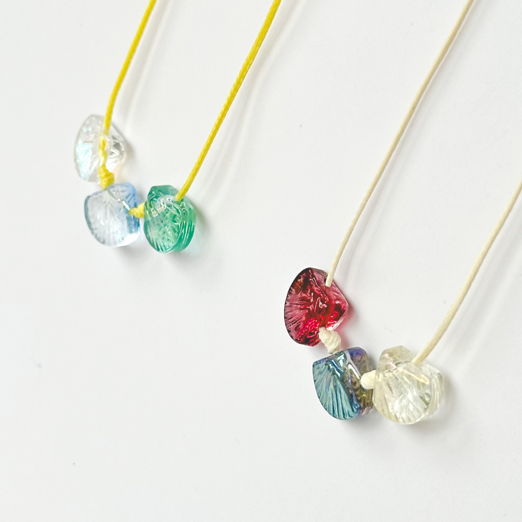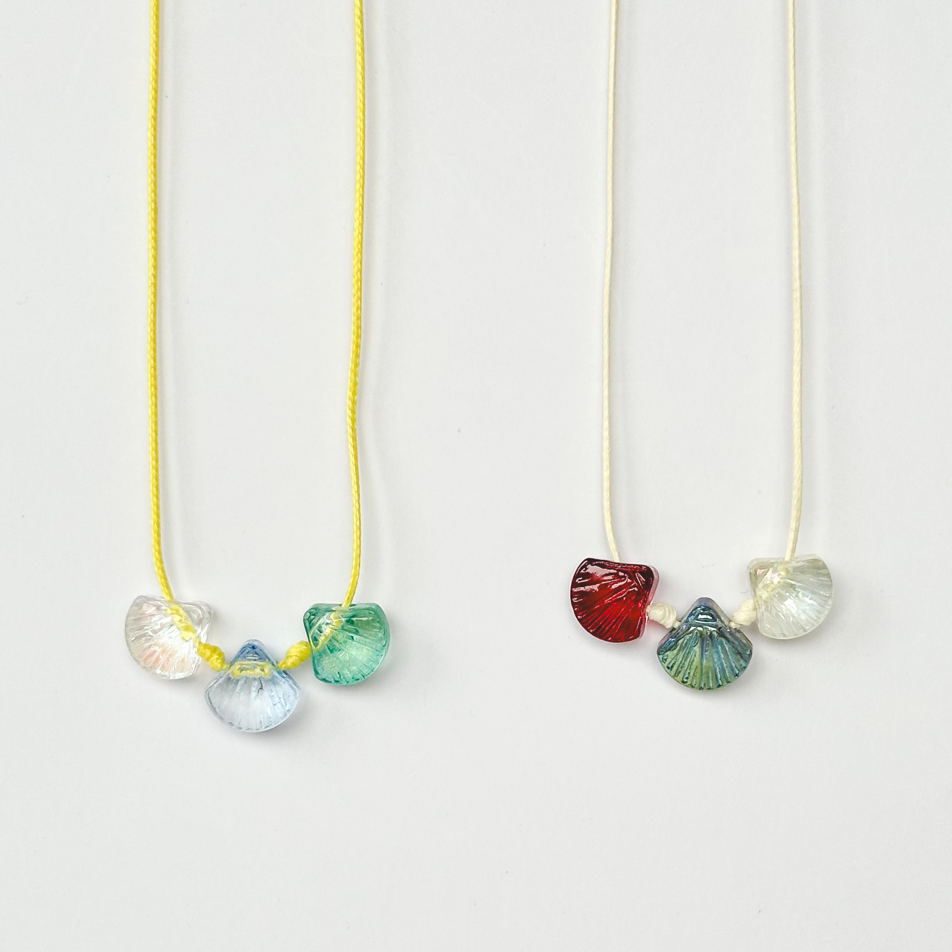 • Materials: A trio of ombre Czech glass scallop sea shell charms, waxed polyester cord, glass seed beads