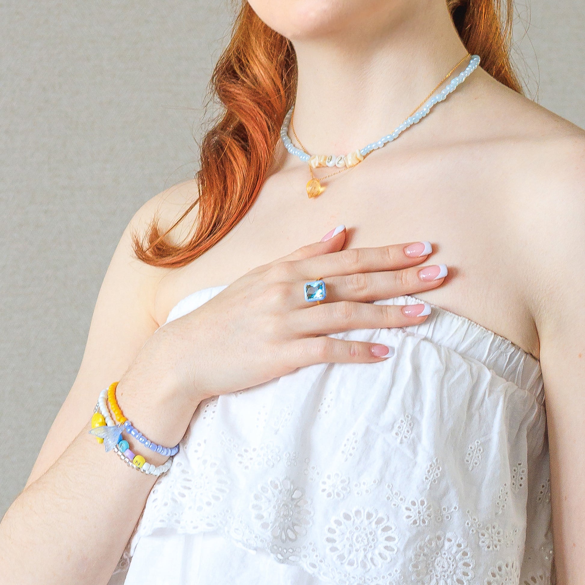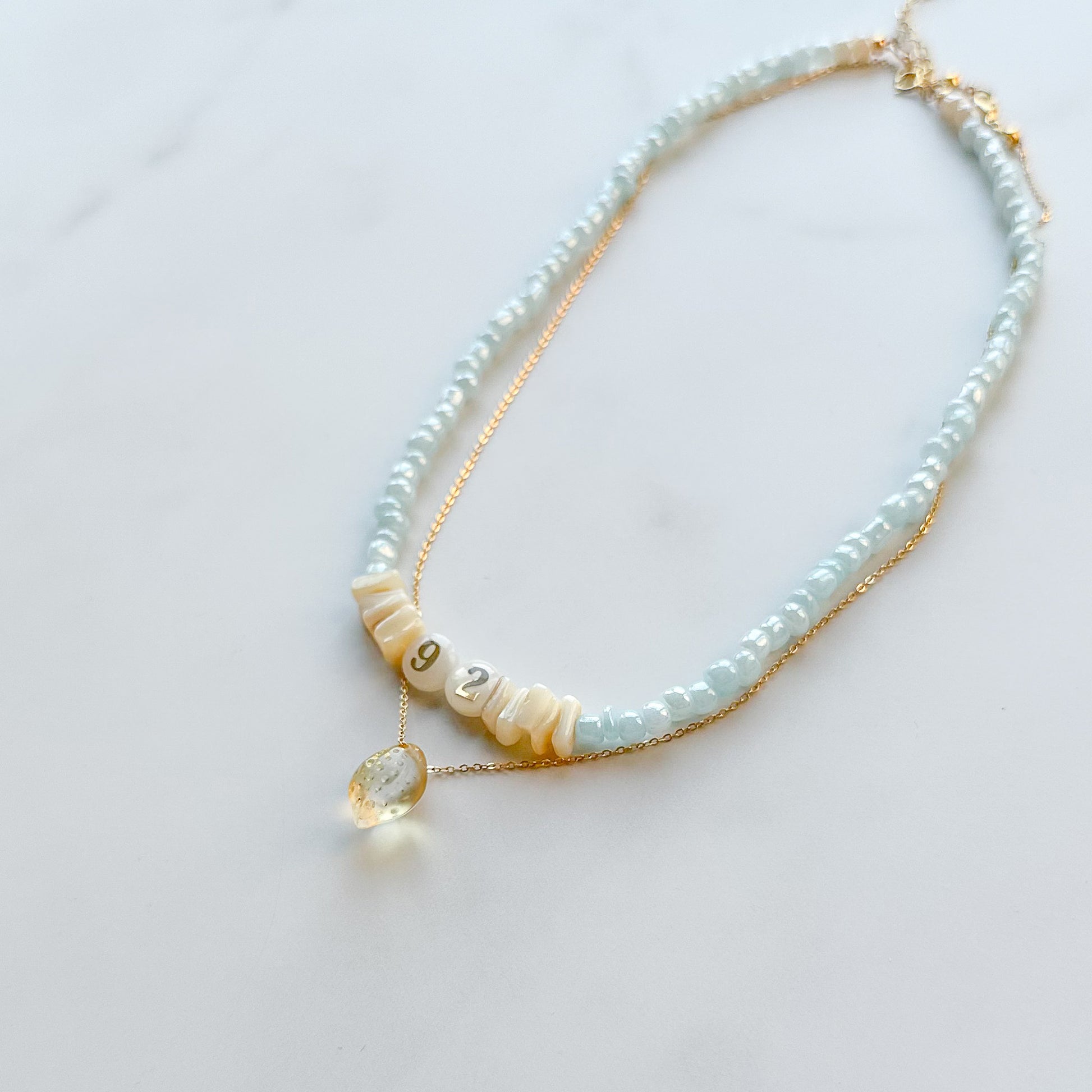- A duo of gold-filled cable chain and glass seed beaded necklaces decorated with a lemon charm, natural shell chips and the option to add a series of mother of pearl number beads, representing your life path number, to the "Kailani" style (please indicate the number in the "special instructions" section of shopping cart):