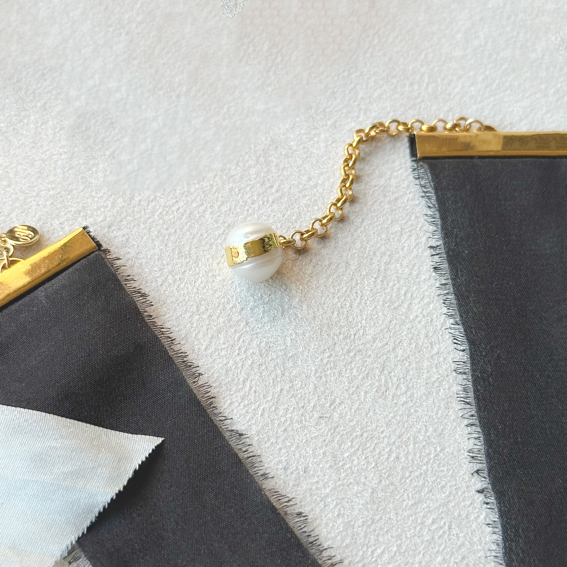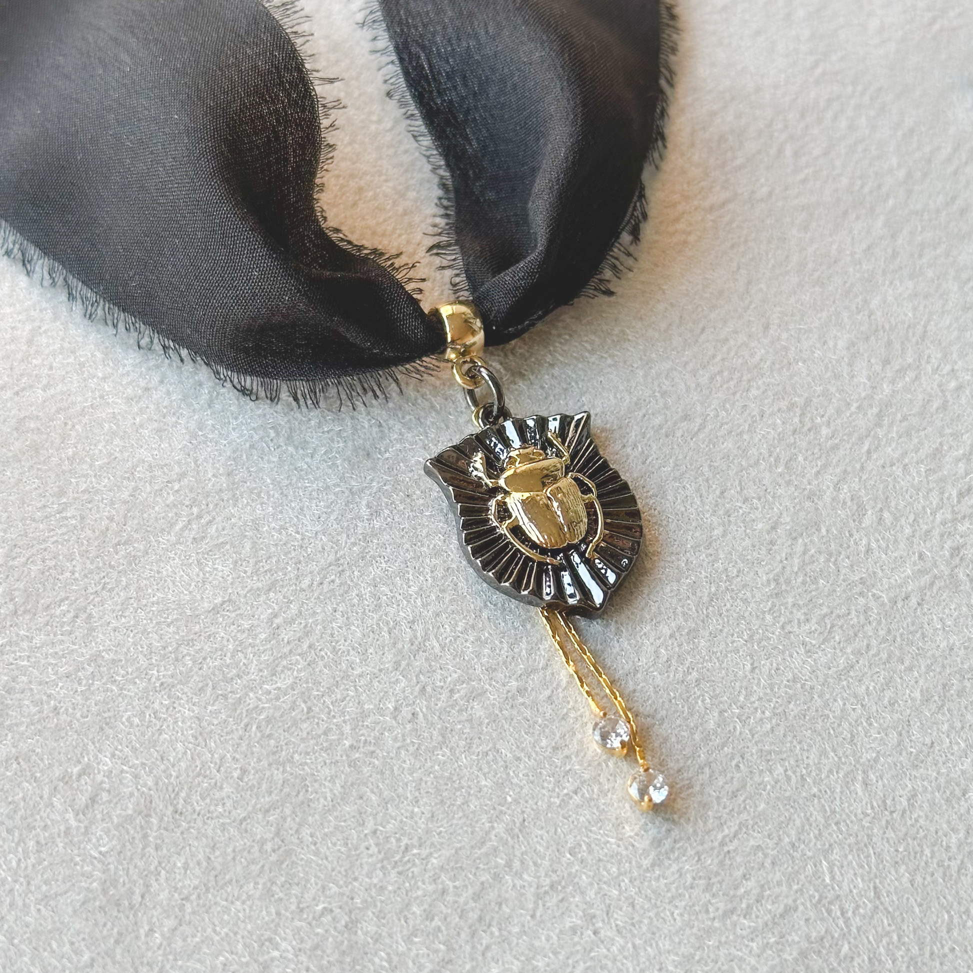 - Materials: Gold filled and brass beetle shield pendant, black crepe de chine silk ribbon with frayed edge, banded freshwater pearl end charm, gold plated cz accents and components