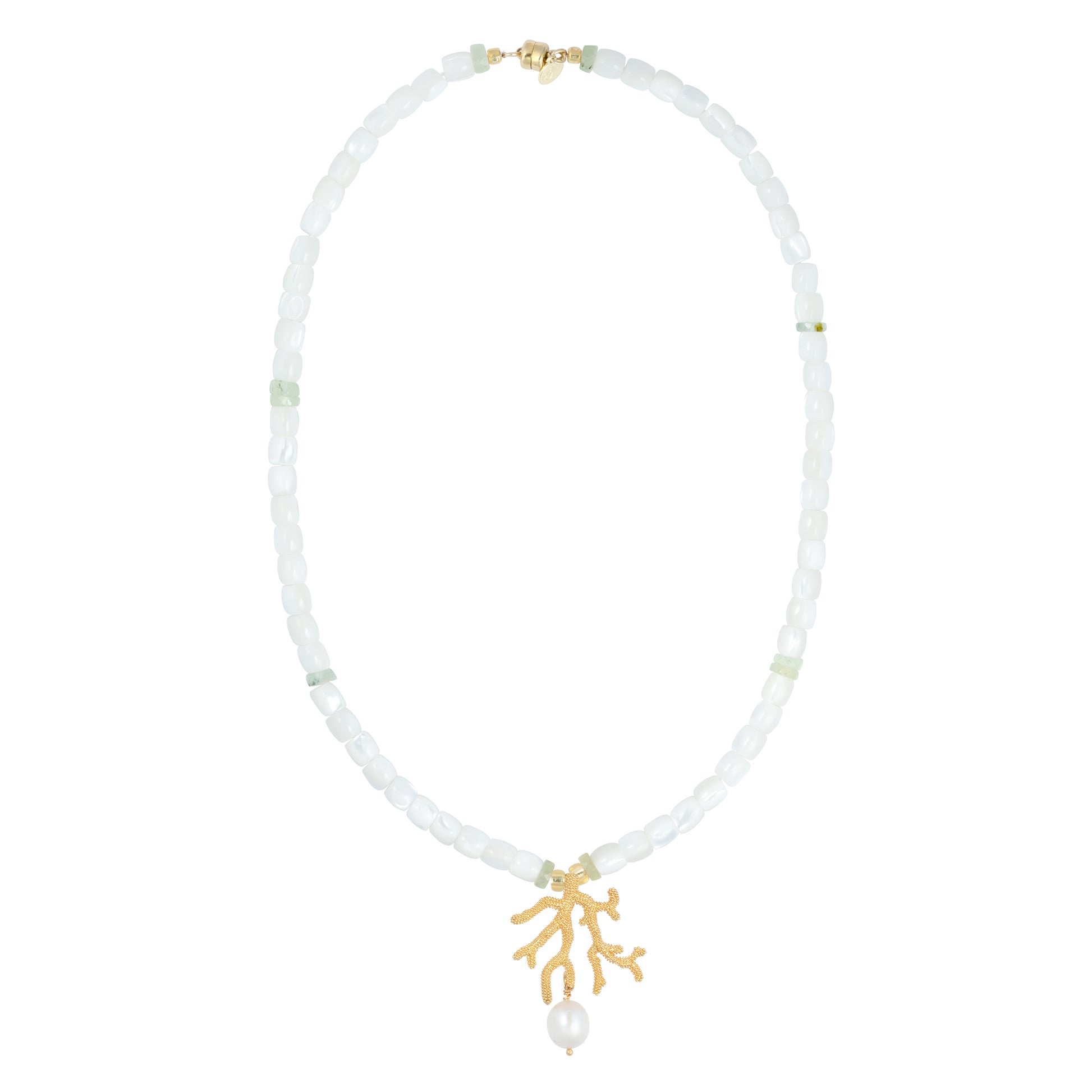 - Materials: Gold plated brass coral pendant, mother of pearl beads, prehnite gemstones, freshwater pearl, Miyuki glass seed beads, gold plated components