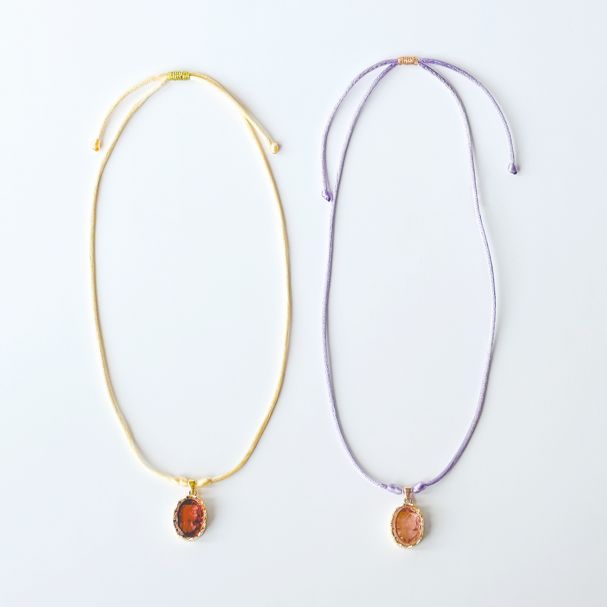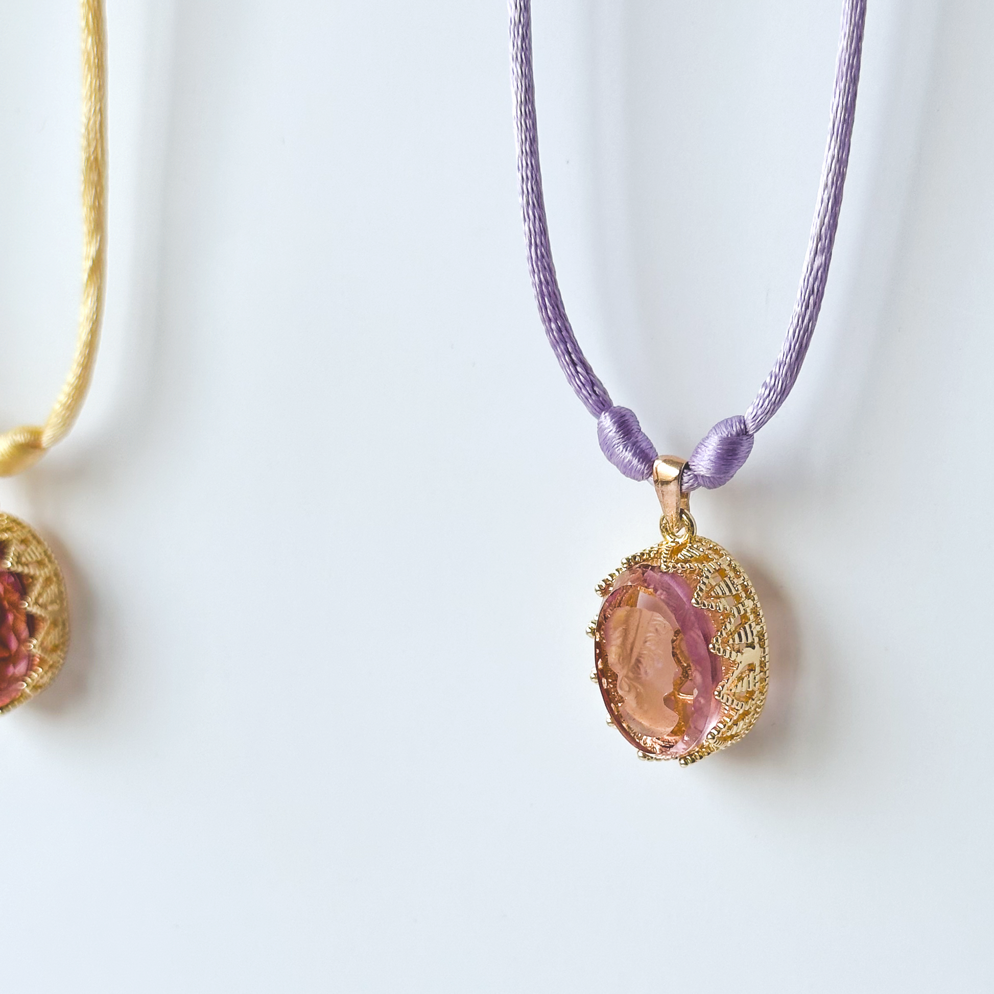- Materials: Vintage German glass intaglios (cameos), satin nylon cords, metallic polyester thread, gold plated sterling silver and brass components