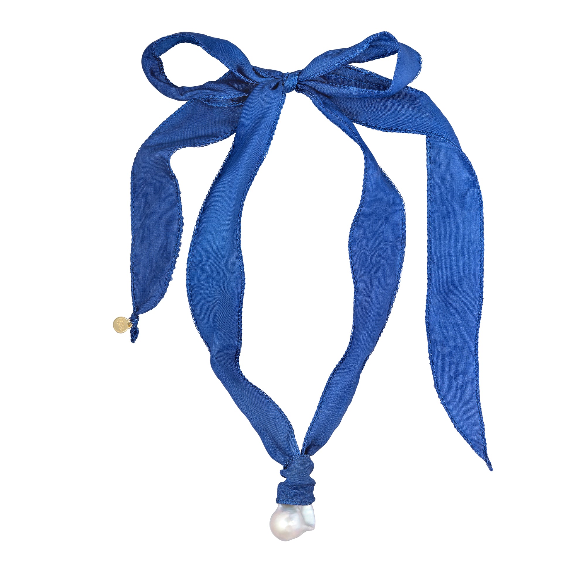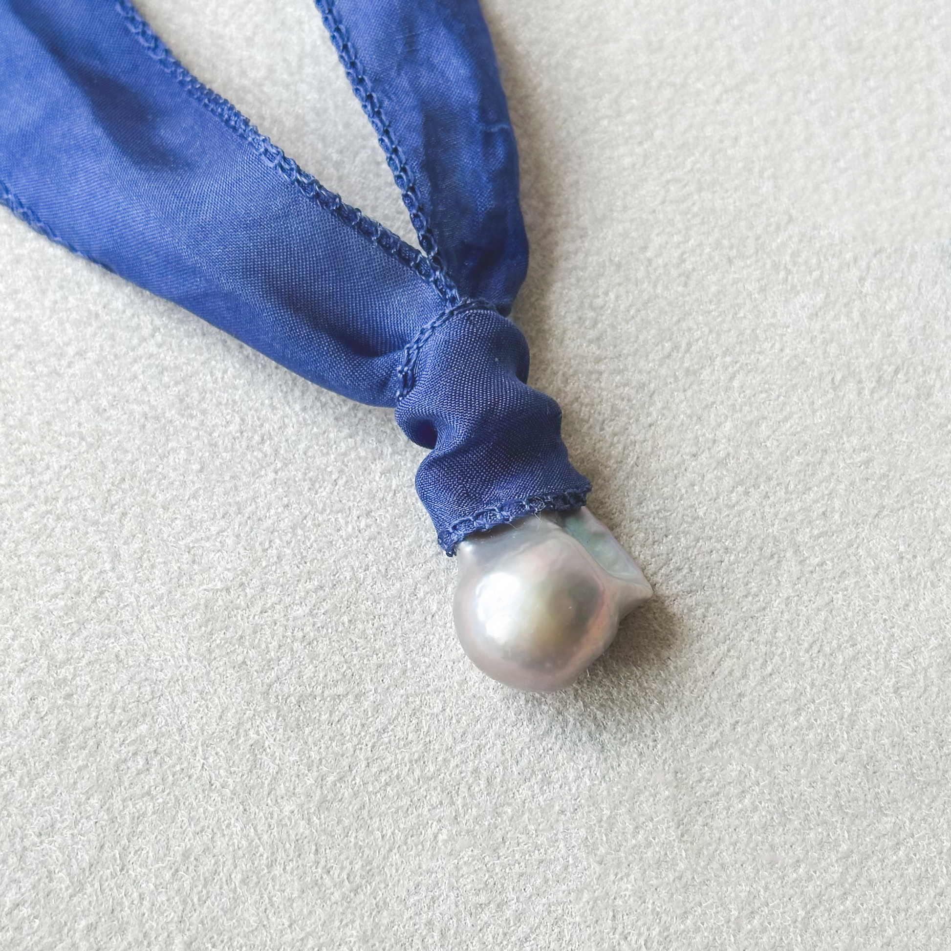 - Materials: Blue-gray fireball pearl pendant, hand-stitched habotai silk ribbon, gold plated component