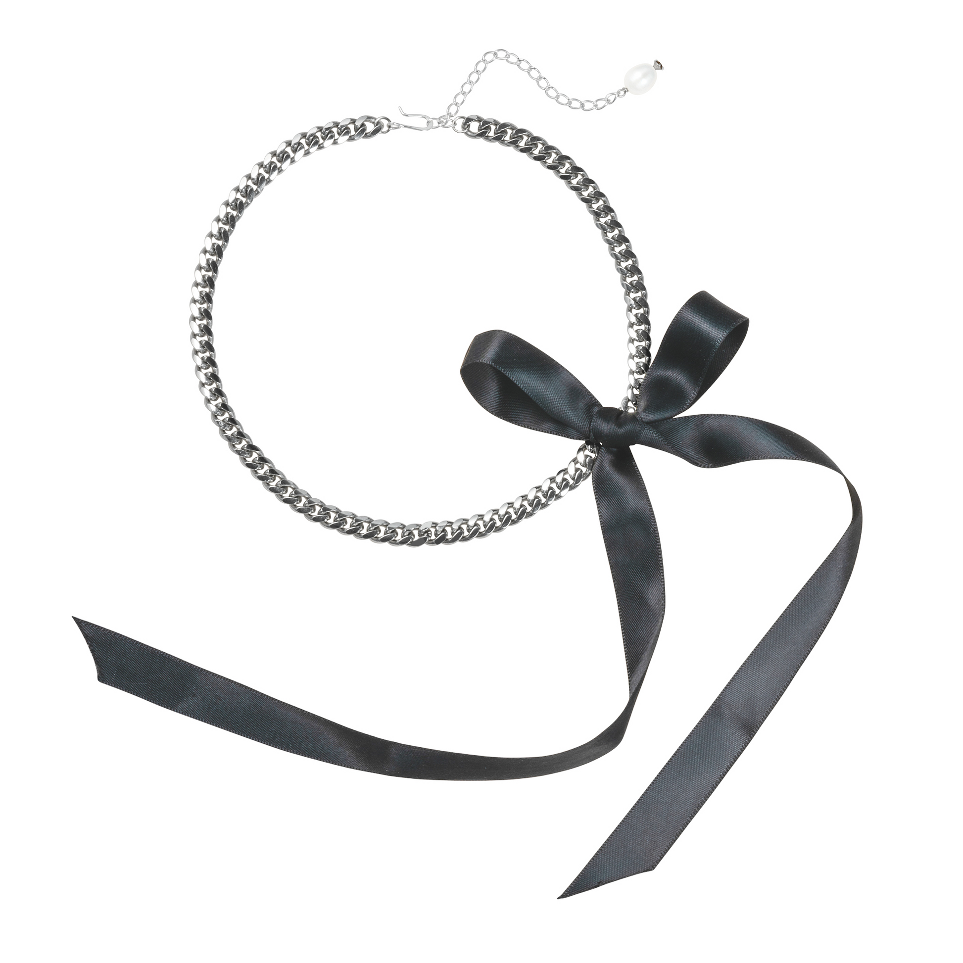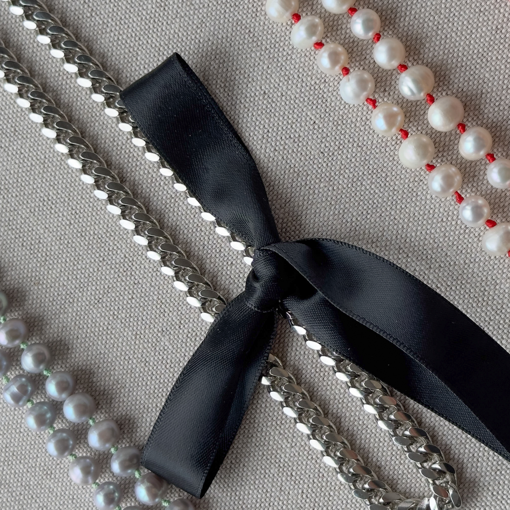• Materials: Silver plated brass curb chain, black satin polyester ribbon, freshwater pearl, crystal and silver plated components