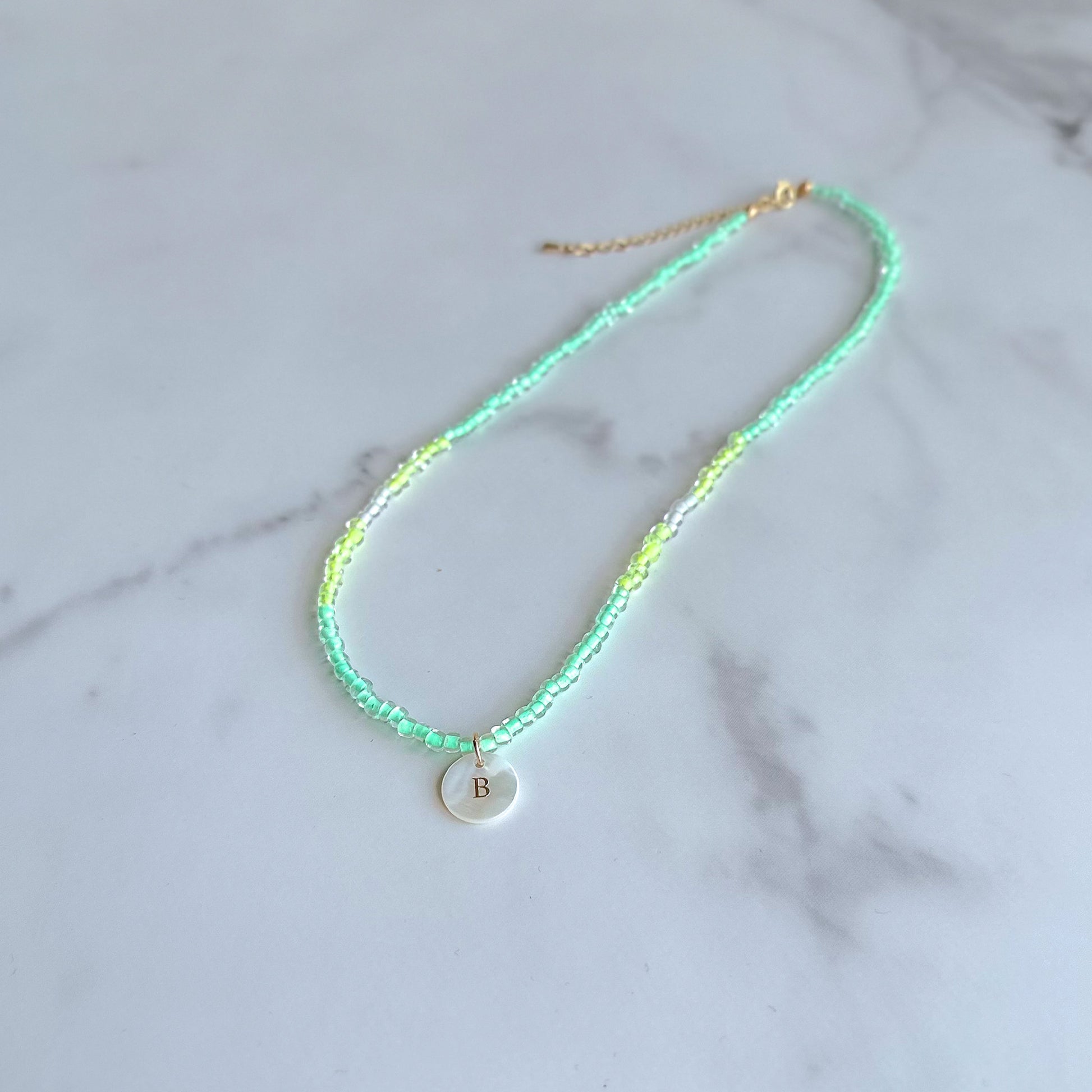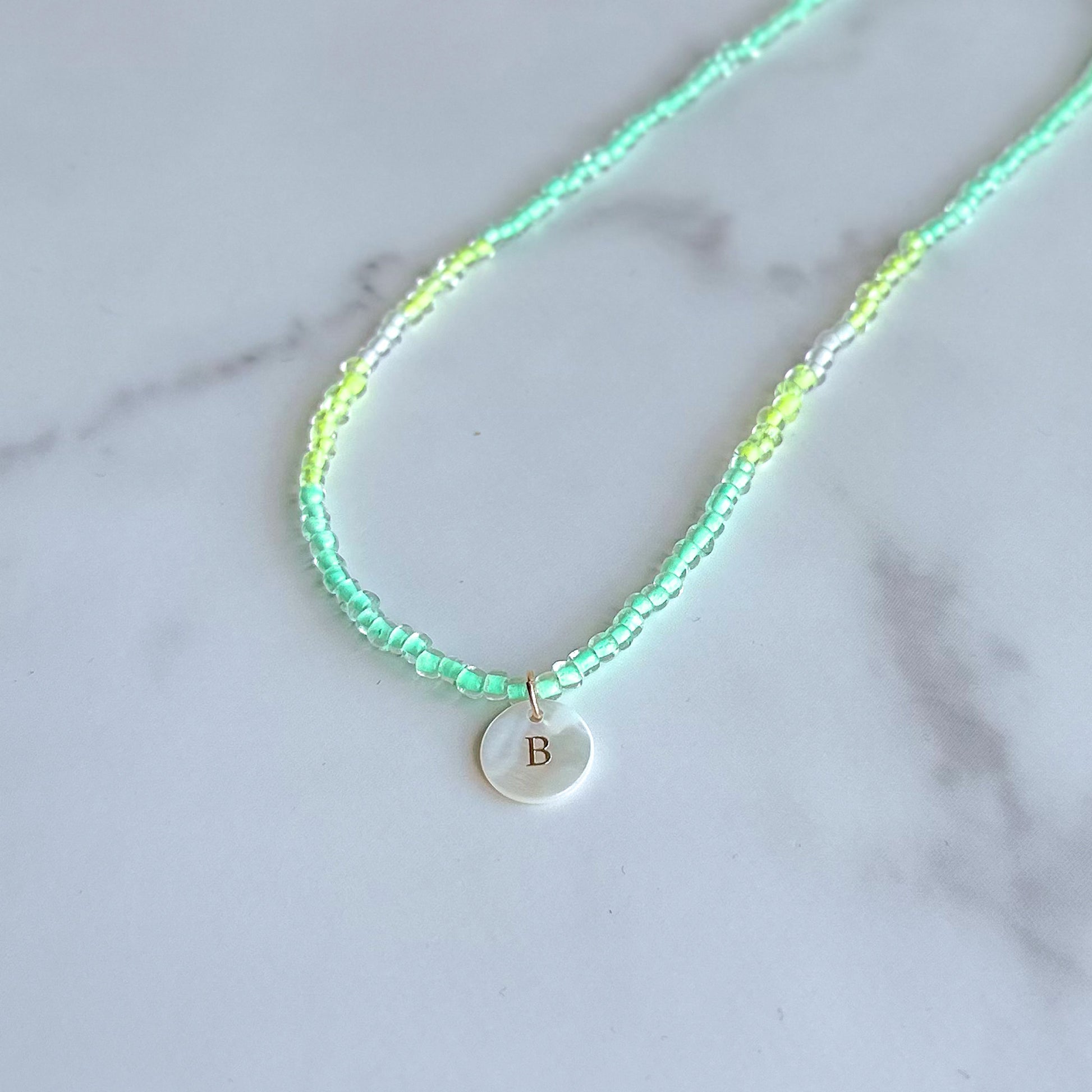 - Handmade glass seed beaded necklace in a seafoam and neon green colorway with optional mother of pearl initial tag (please indicate the letter in the "order special instructions" section of shopping cart)