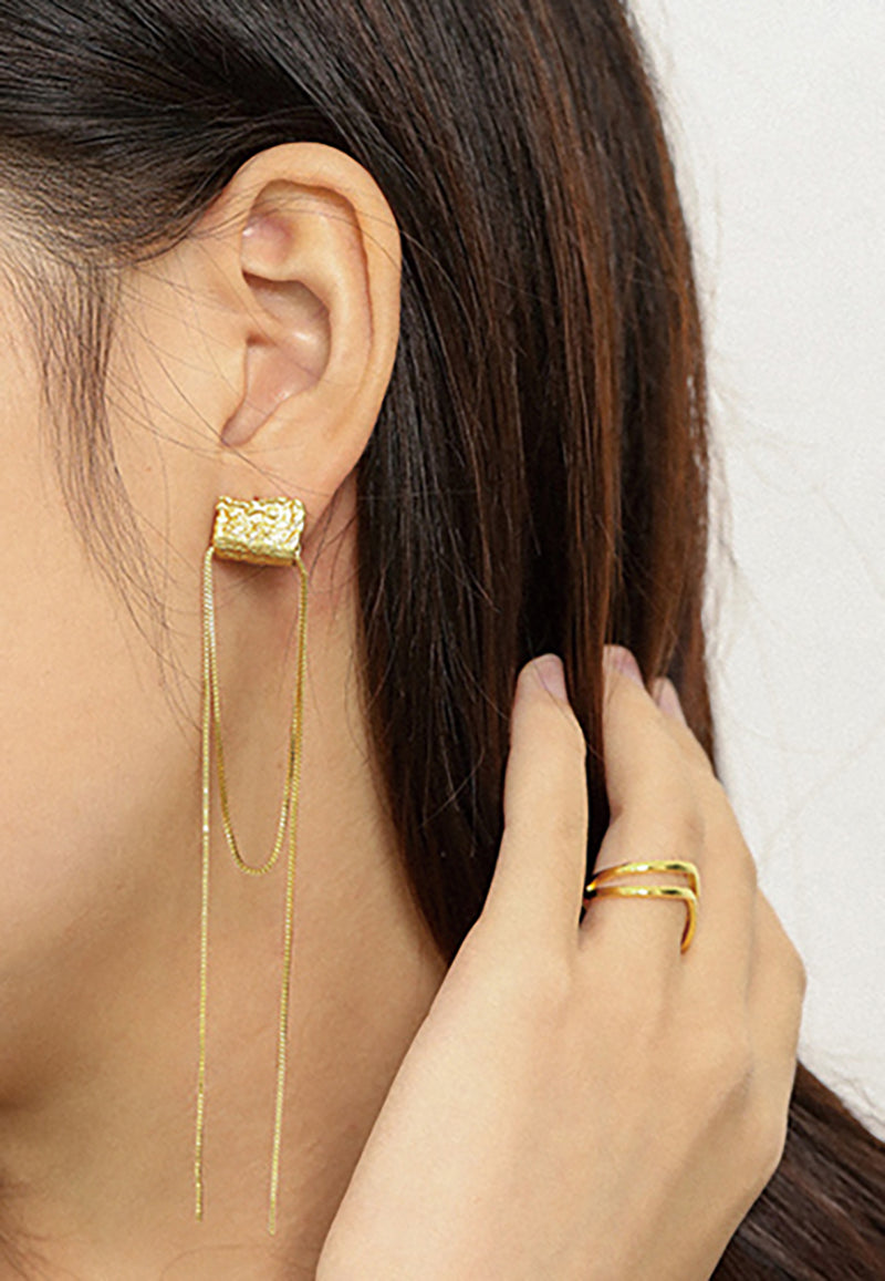 - 18K gold plated Sterling Silver hammered metal and draped chain asymmetrical earrings.