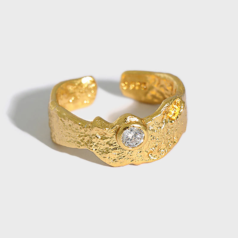 - 18K gold plated Sterling Silver hammered metal open ring with a zircon accent.