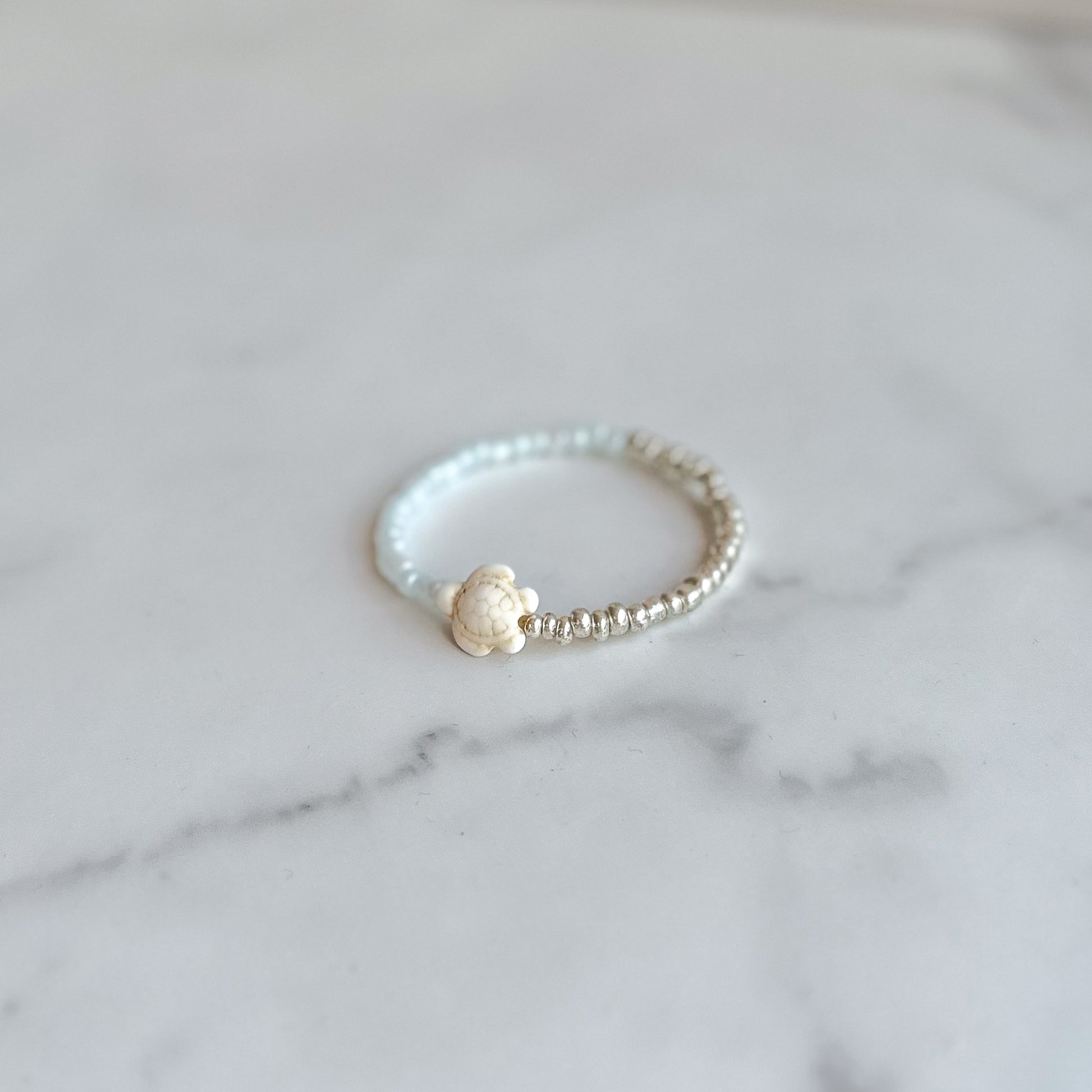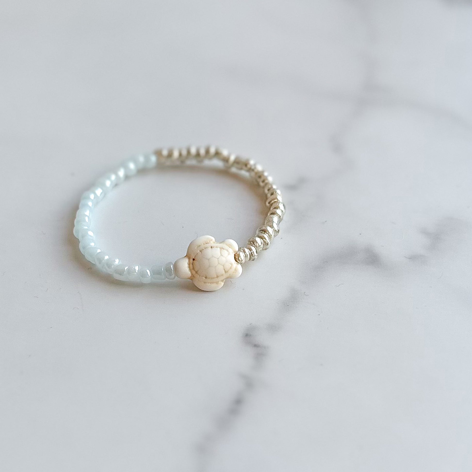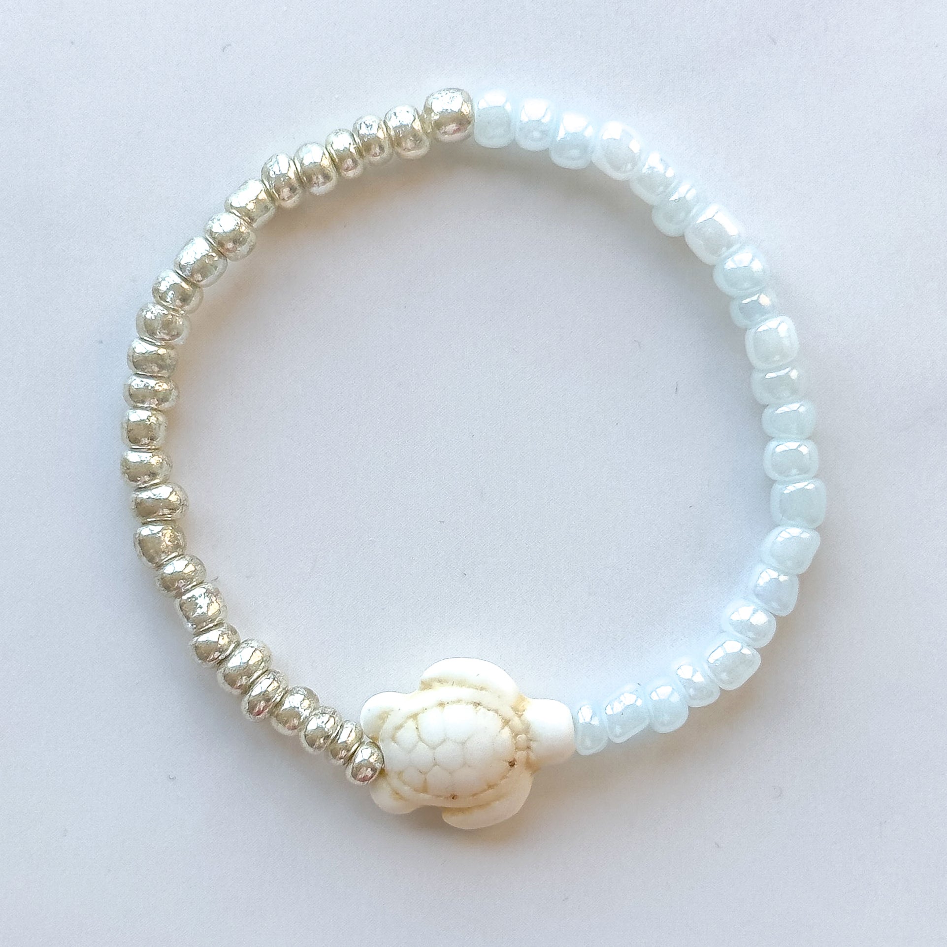 - Handmade glass seed beaded stretch bracelet, accented with a howlite turtle charm