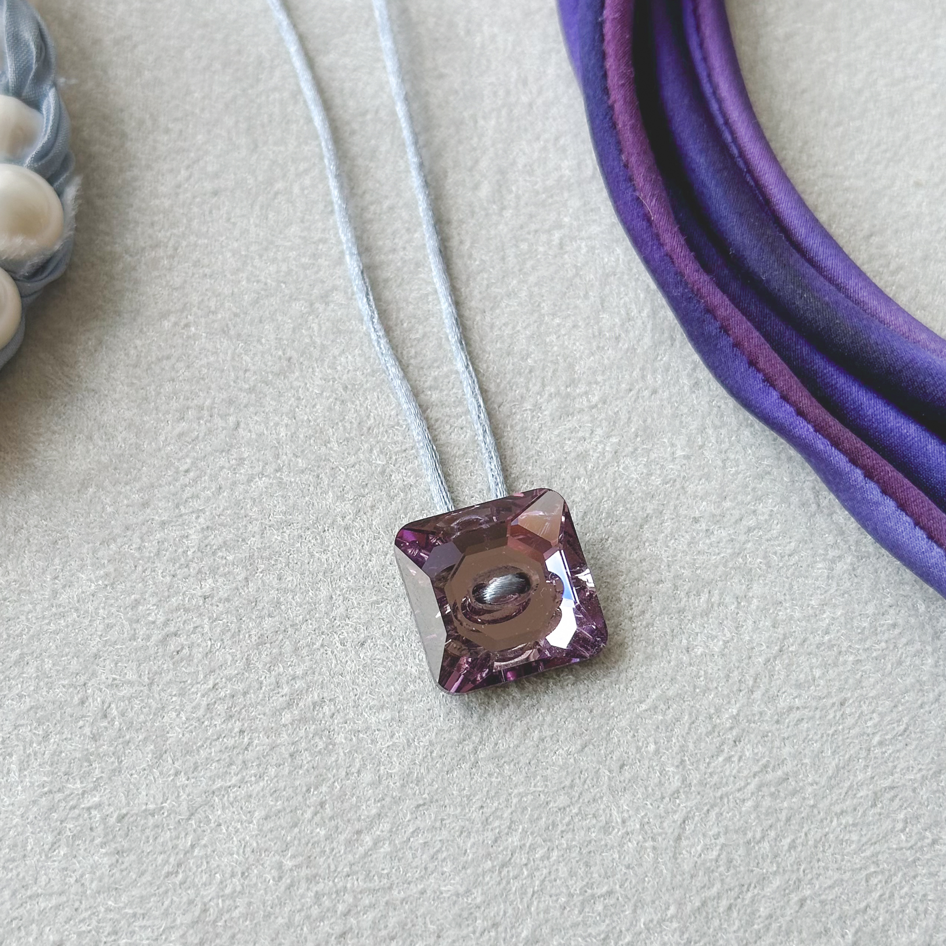 - Materials: Vintage Swarovski crystal button, satin nylon cord, waxed polyester cord, gold plated component