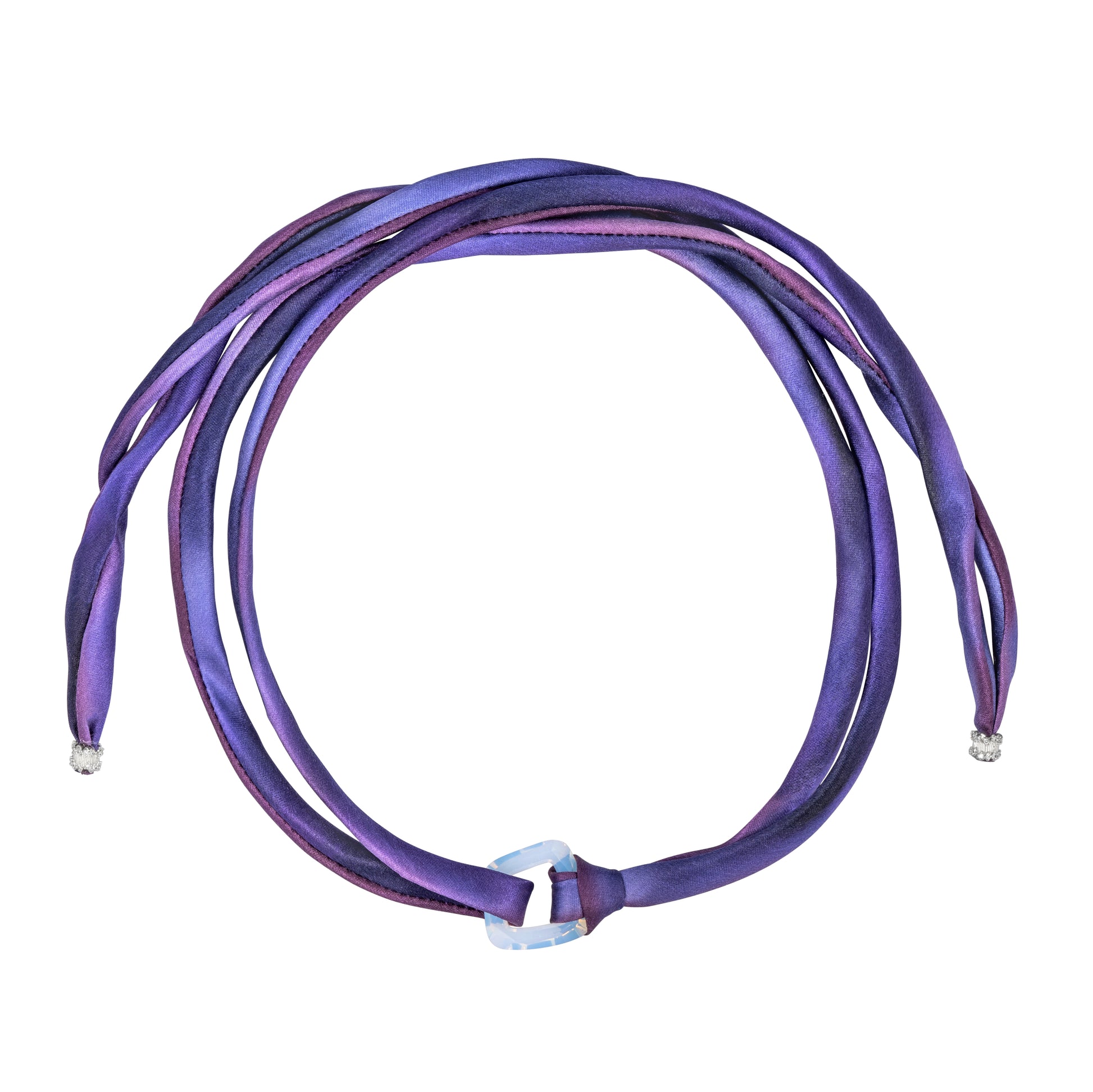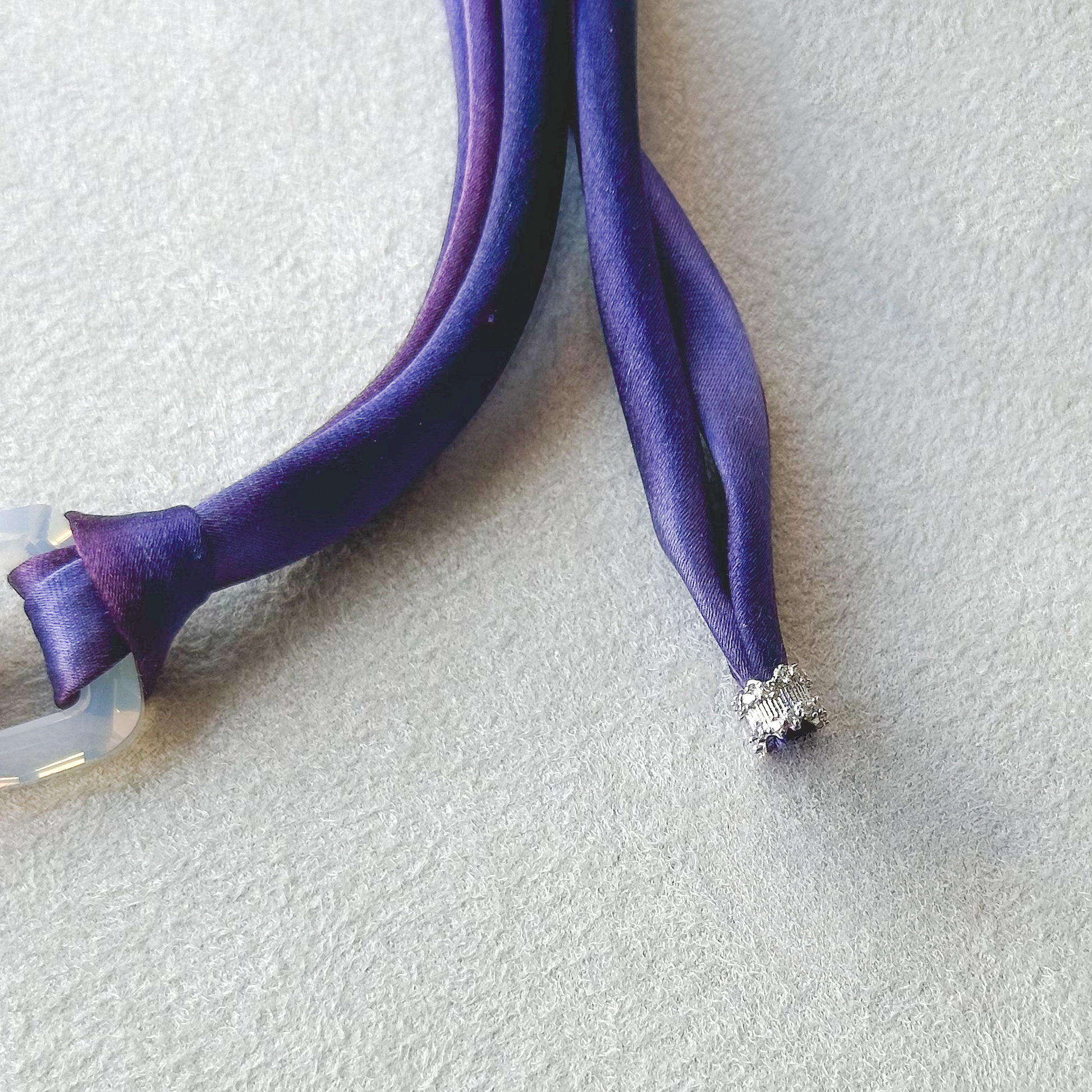 - Materials: Vintage Swarovski white opal square cosmic crystal ring pendant, hand-dyed purple-violet ombre silk charmeuse fabric, silver plated cz components
