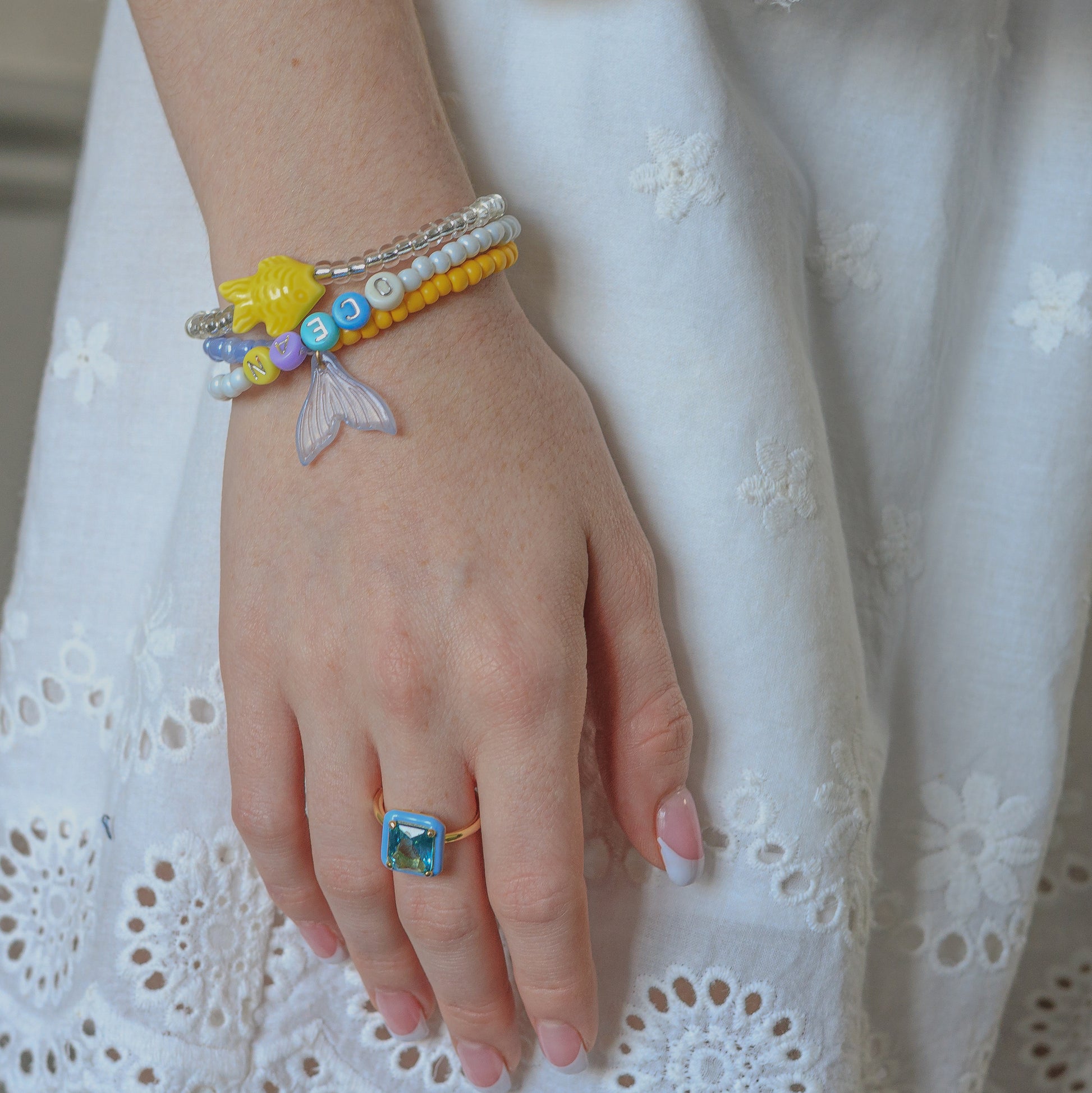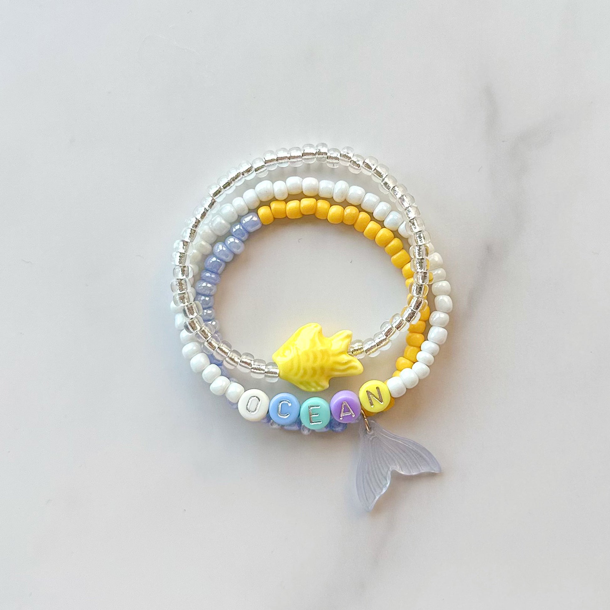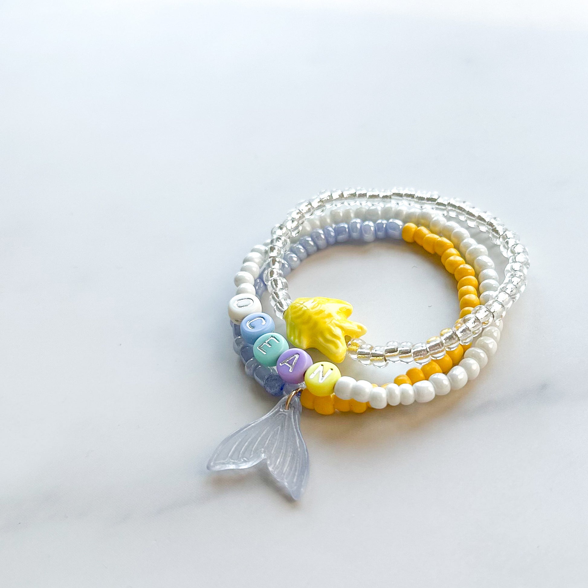 - A bundle of 3 handmade glass beaded stretch bracelets, accented with fish and mermaid charms and pastel letter beads, including the option to personalize the "Marina" style with your name (please indicate the name in the "special instructions" section of shopping cart):
