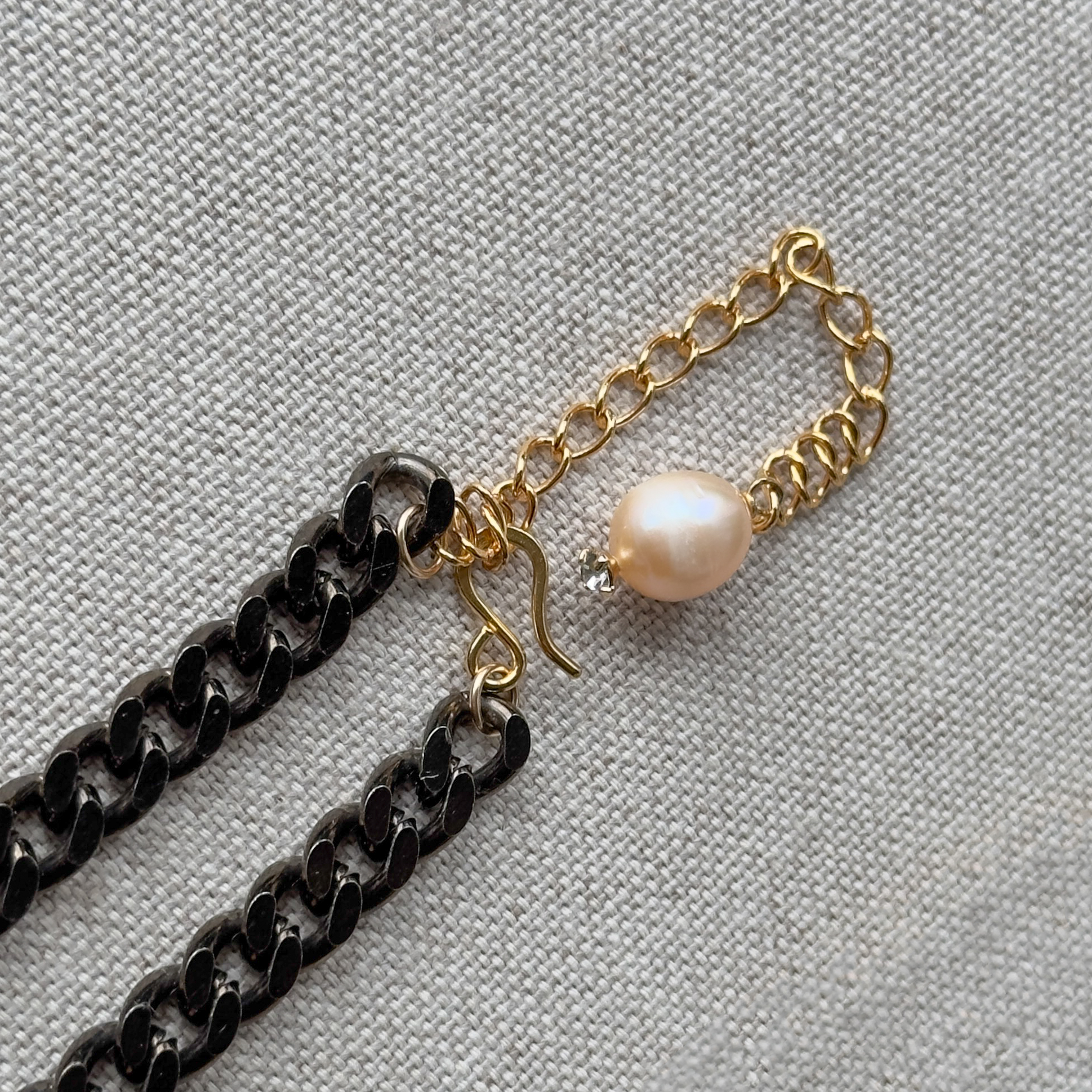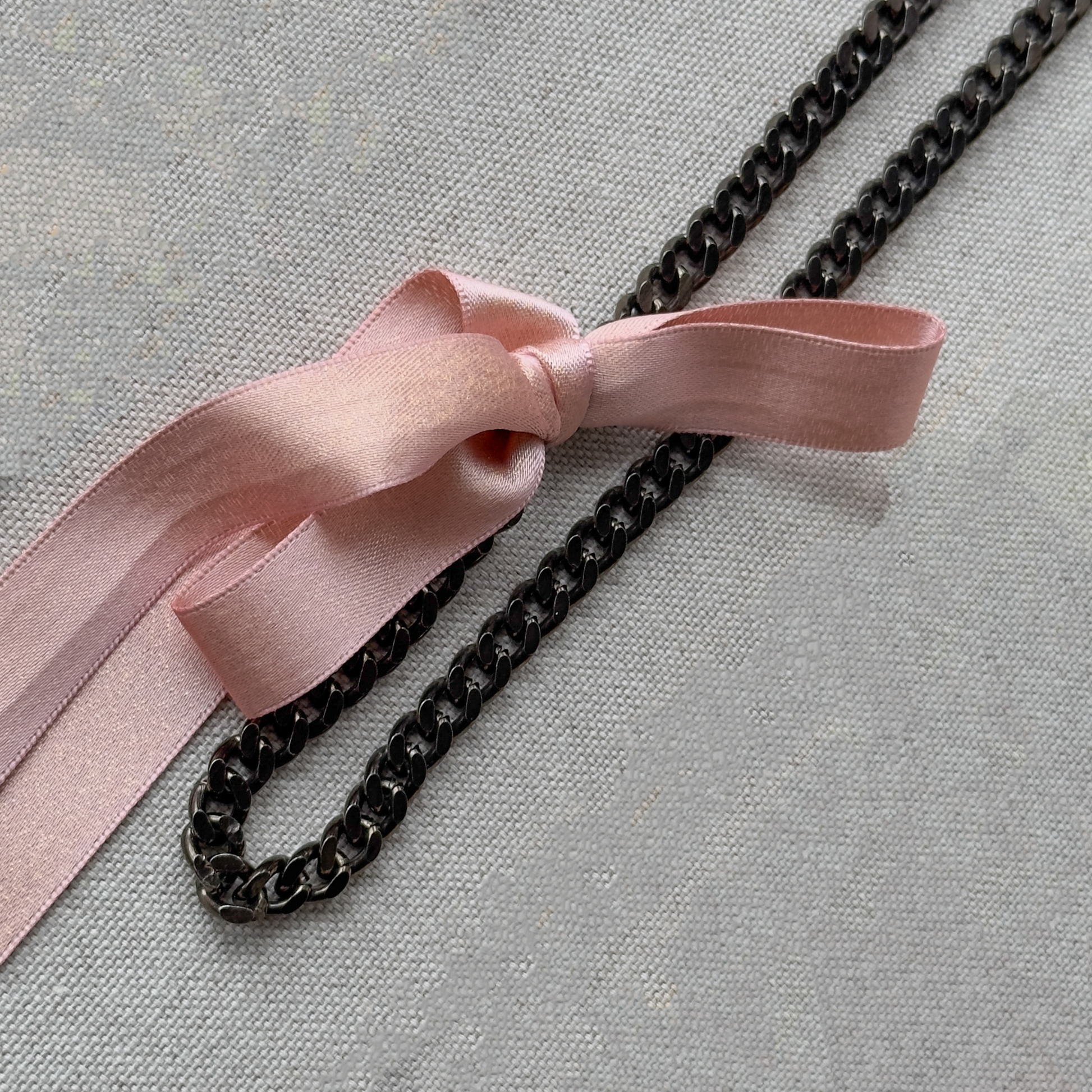 • Materials: Gunmetal curb chain, peach satin polyester ribbon, freshwater pearl, crystal and gold plated components