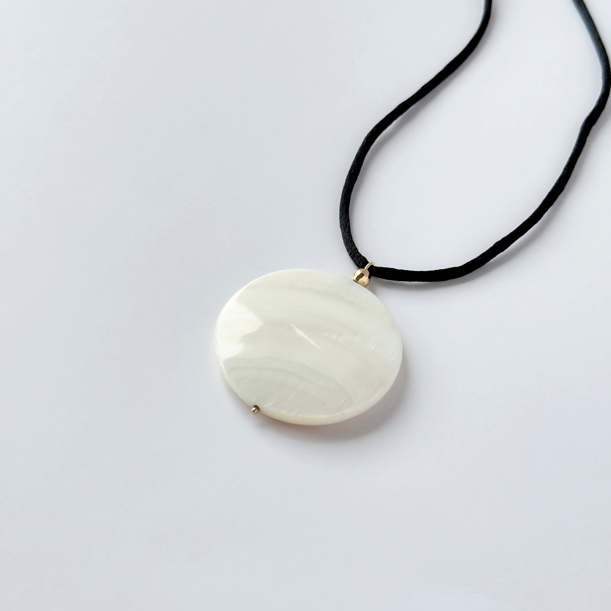 - Materials: Satin nylon cord, mother of pearl coin pendant, gold plated components