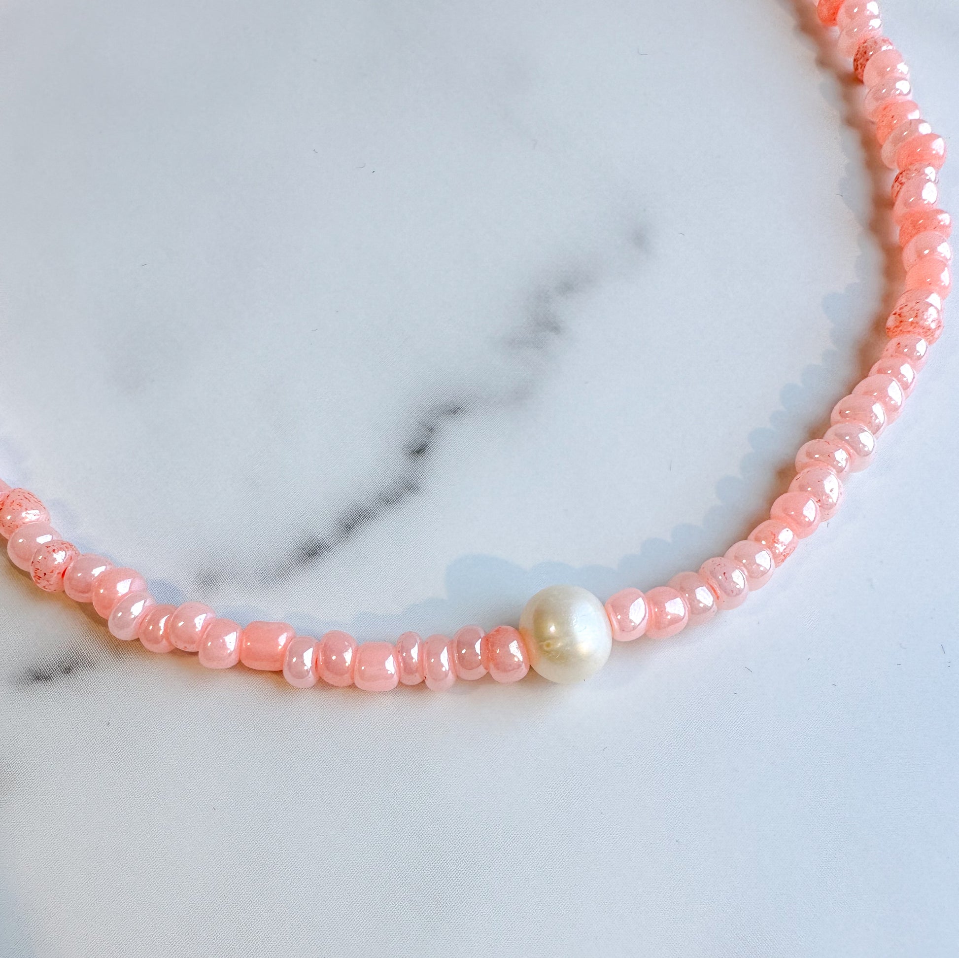 - Handmade glass seed beaded necklace, accented with a fresh water pearl