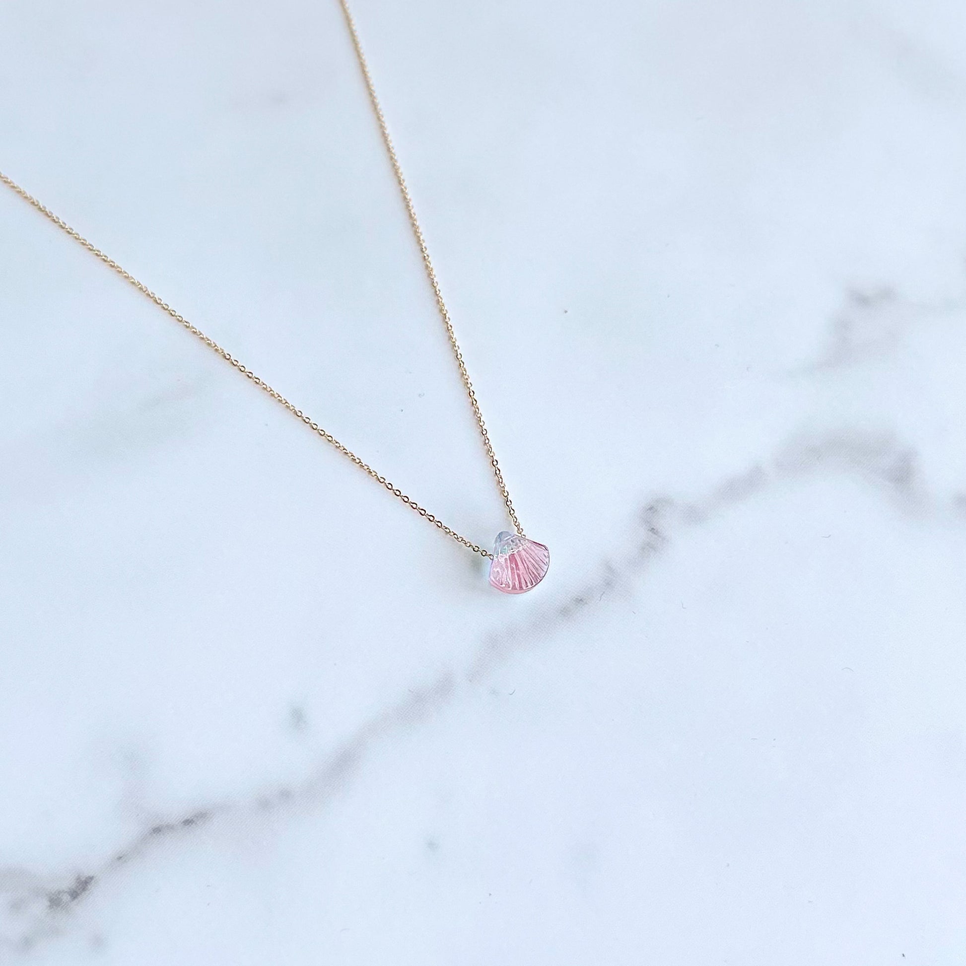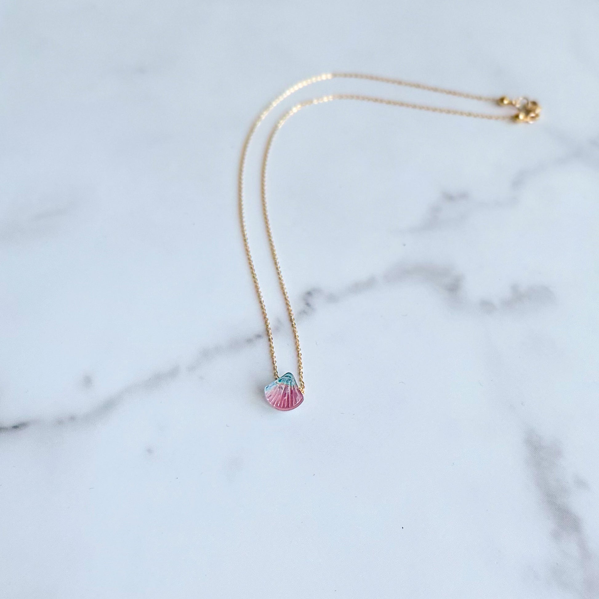 - Gold-filled cable chain necklace with an ombre glass shell charm