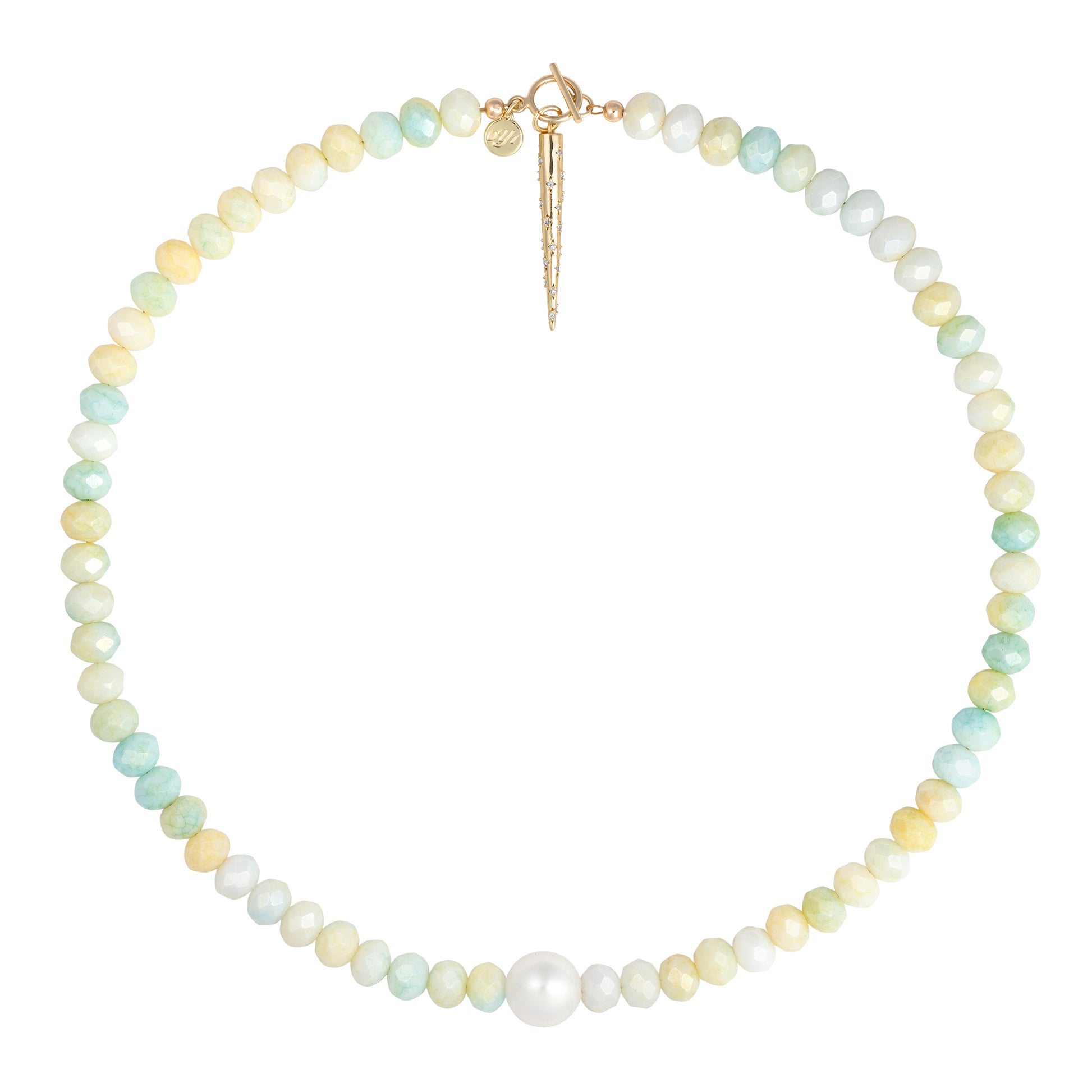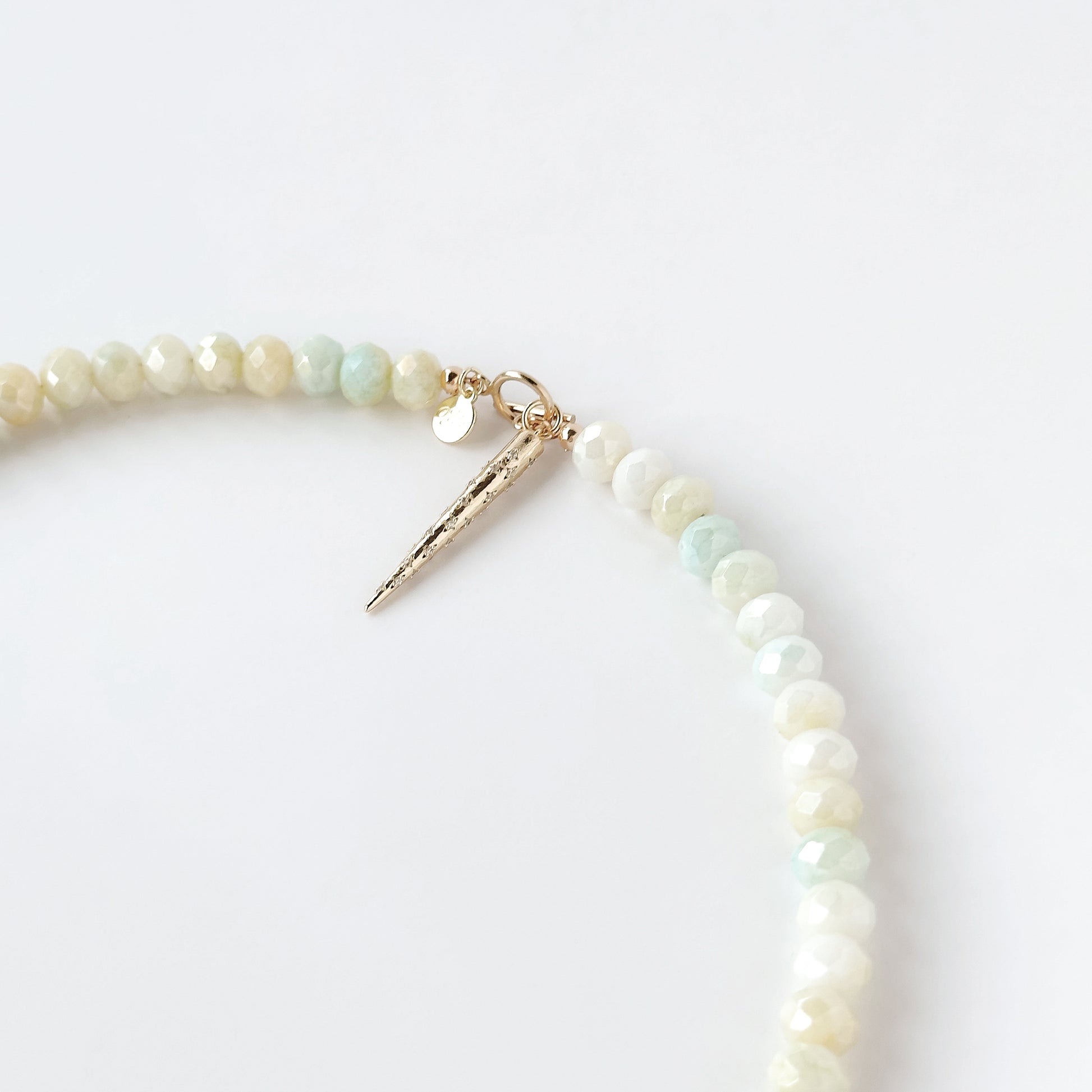 - Materials: Marbled crystal stone beads, Swarovski glass pearl, gold plated CZ spike end charm, gold filled and gold plated components