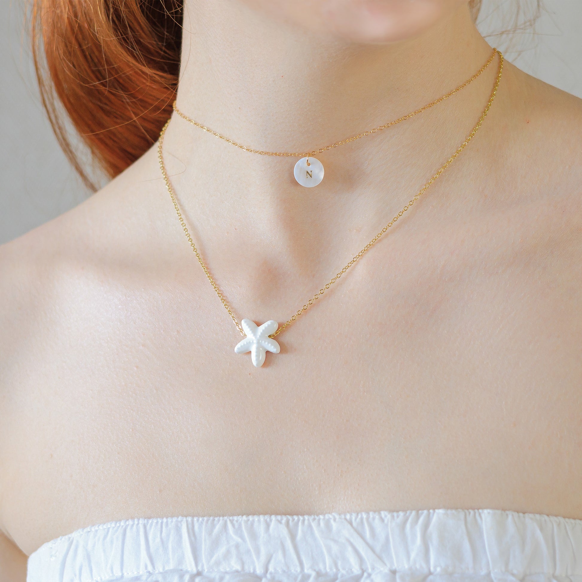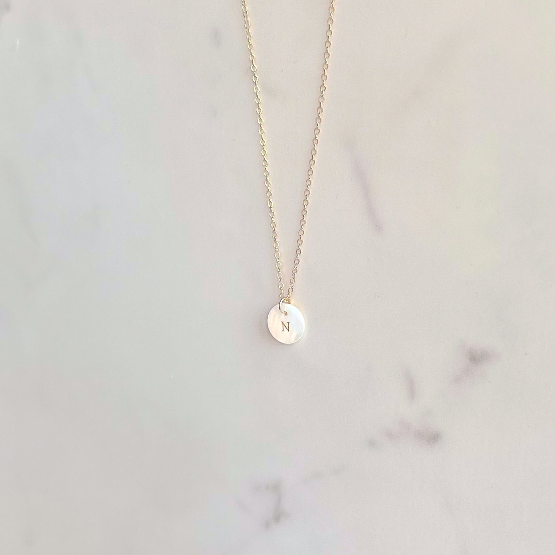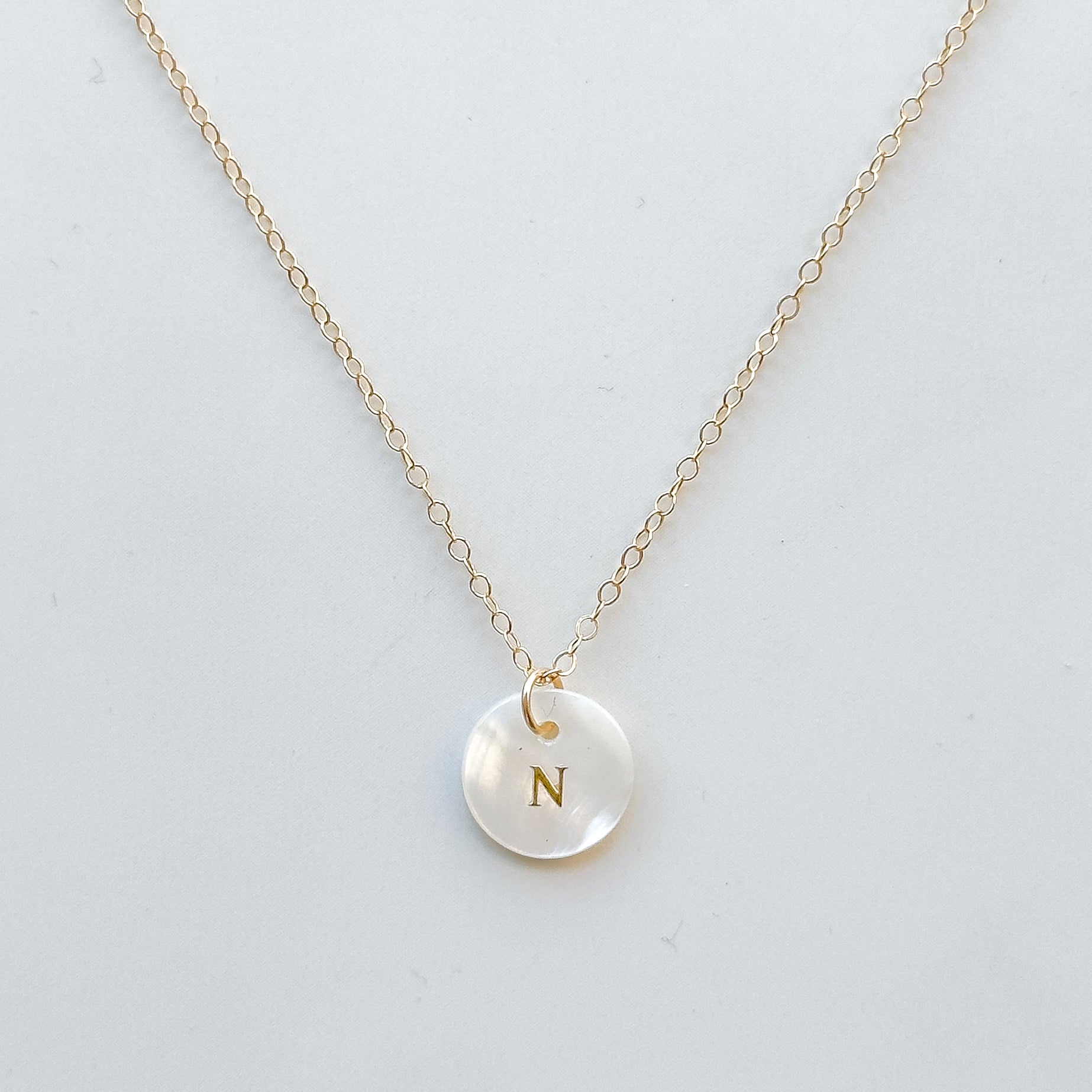 - Gold-filled cable chain necklace with mother of pearl initial tag (please indicate the letter in the "order special instructions" section of shopping cart)
