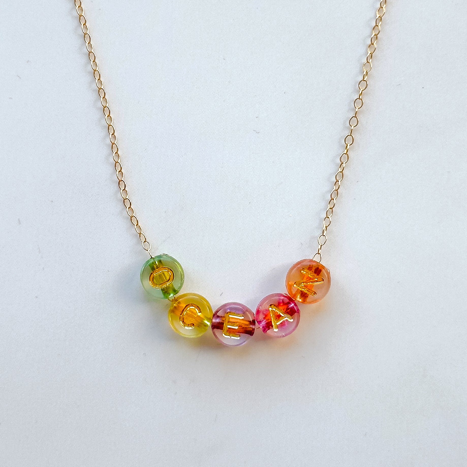 - Gold-filled cable chain necklace with colorful letter beads, including the option to personalize with your name (please indicate the name in the "order special instructions" section of shopping cart)