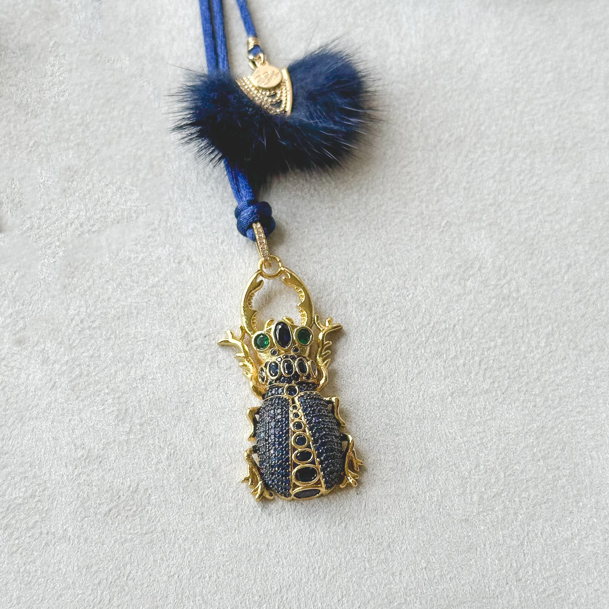 - Materials: Brass cz pave beetle pendant, satin nylon cord, faux mink end charm, gold plated components