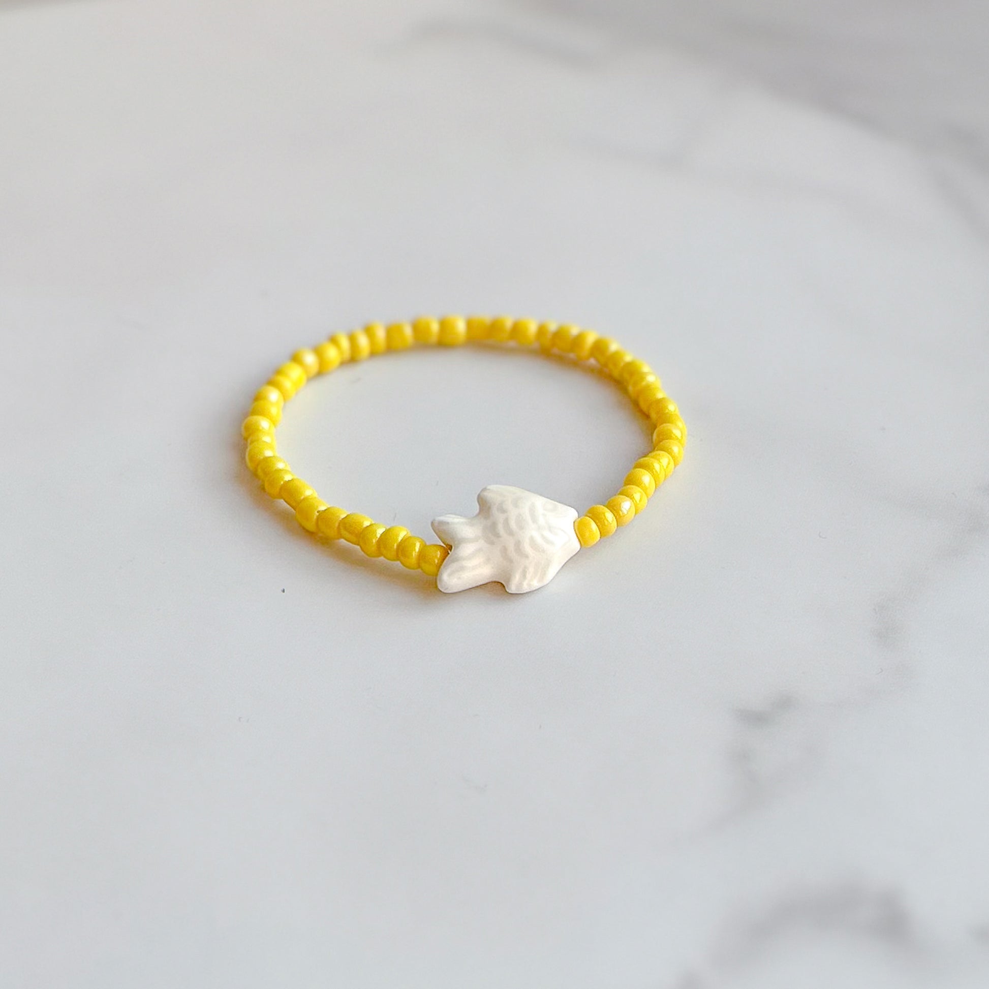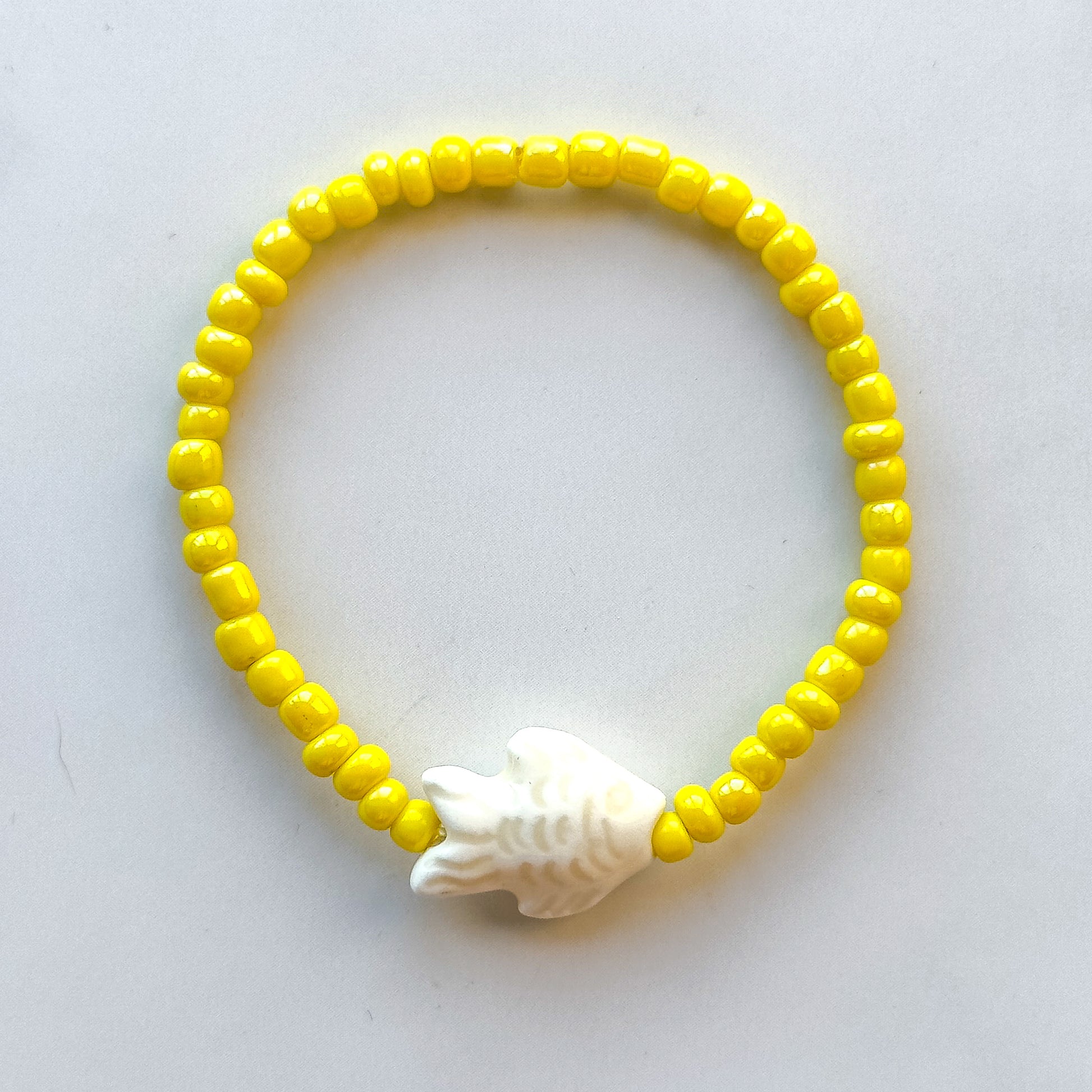 - Handmade glass seed beaded stretch bracelet, accented with a ceramic fish charm