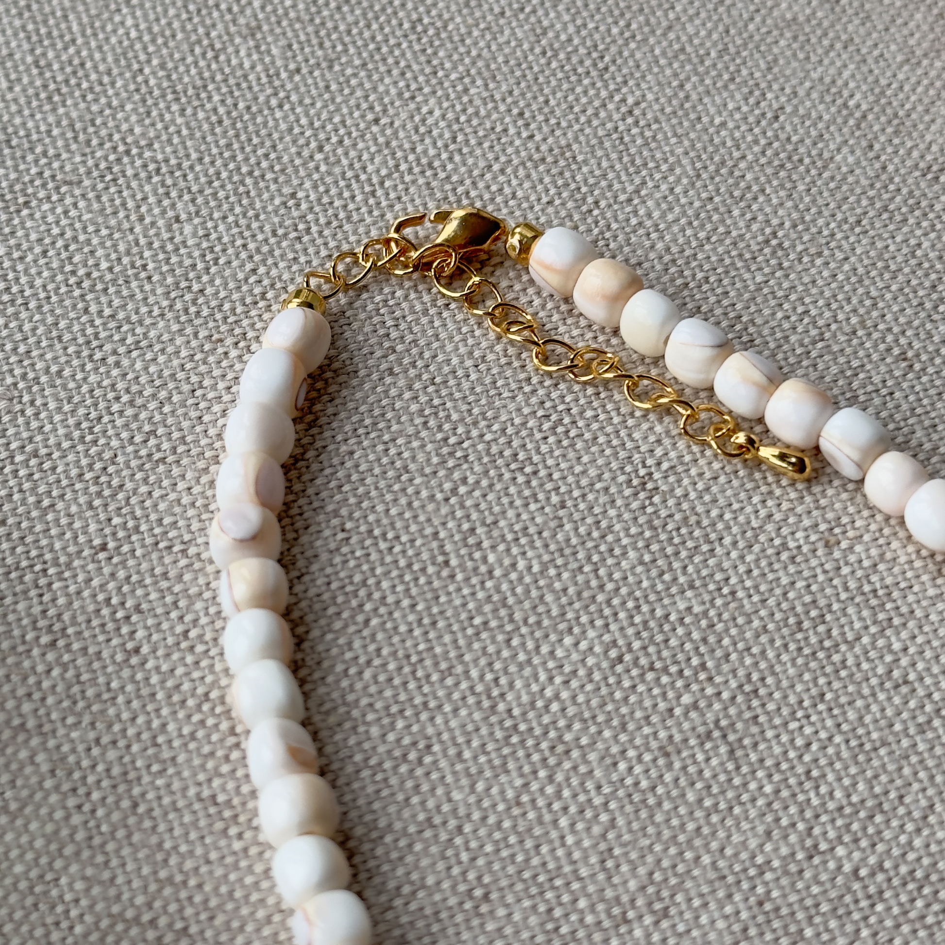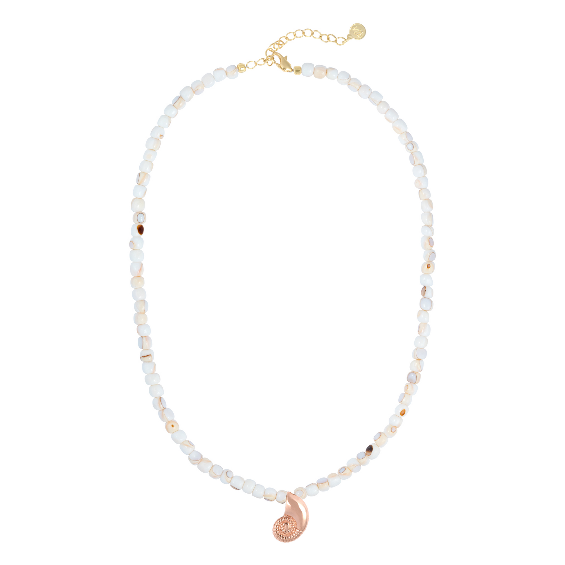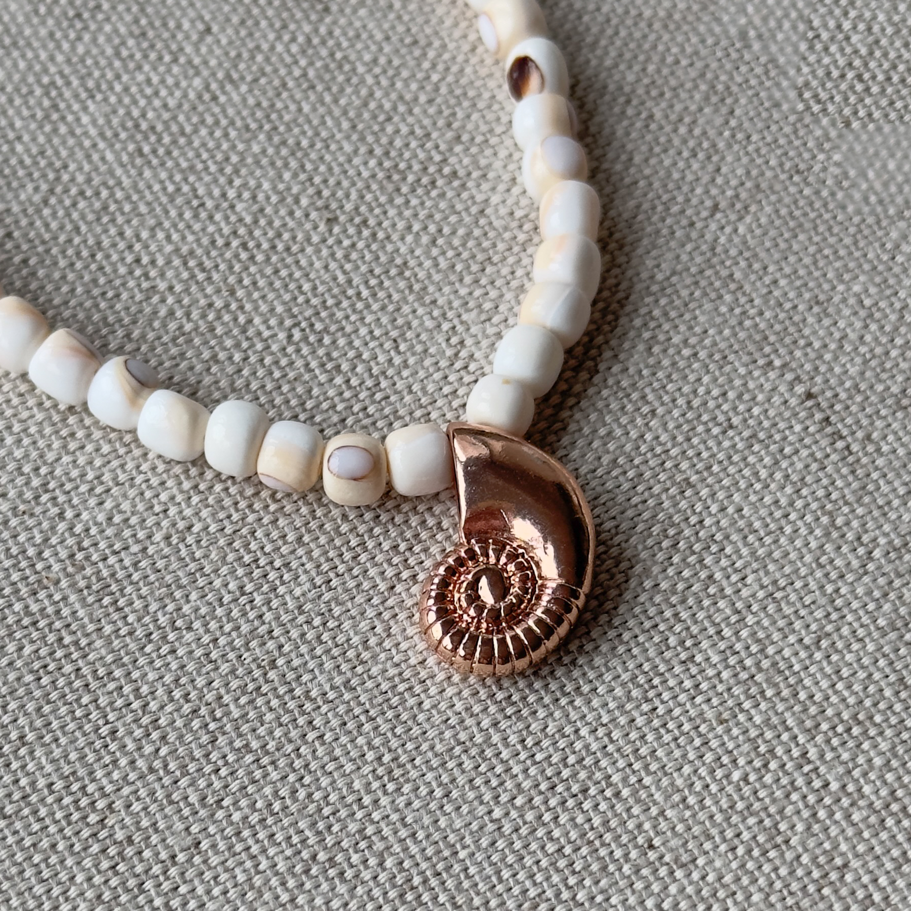 - Materials: 22K rose gold vermeil nautilus shell pendant, Luhuanus sea shell beads, gold plated components