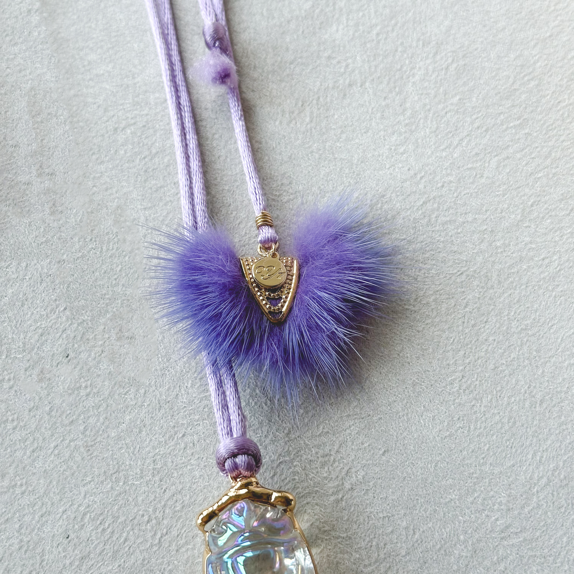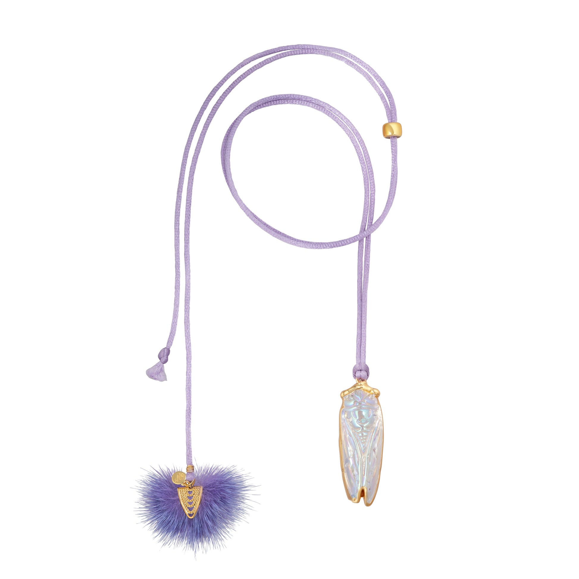 - Materials: Gold trimmed iridescent glass cicada pendant, satin nylon cord, faux mink end charm, gold plated components