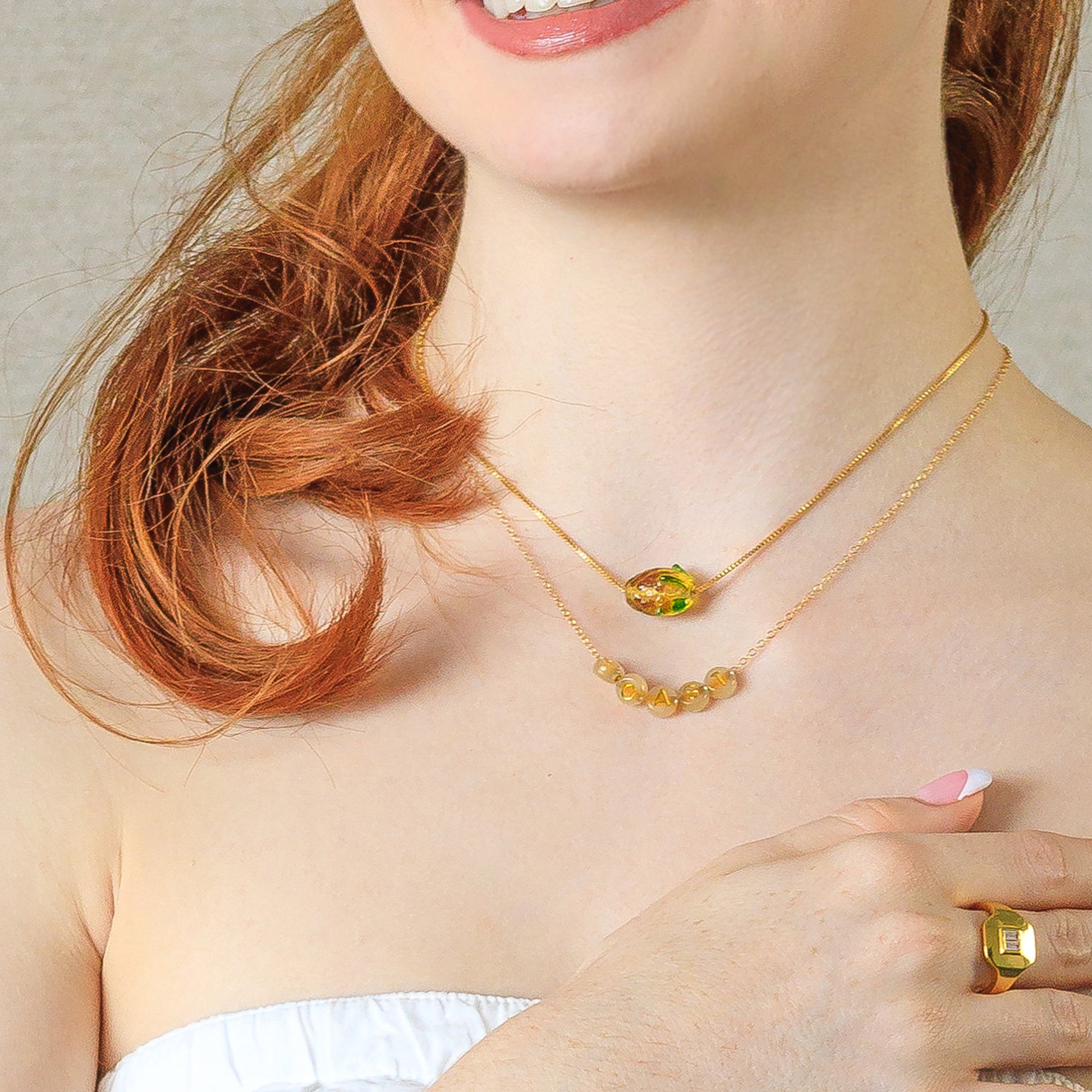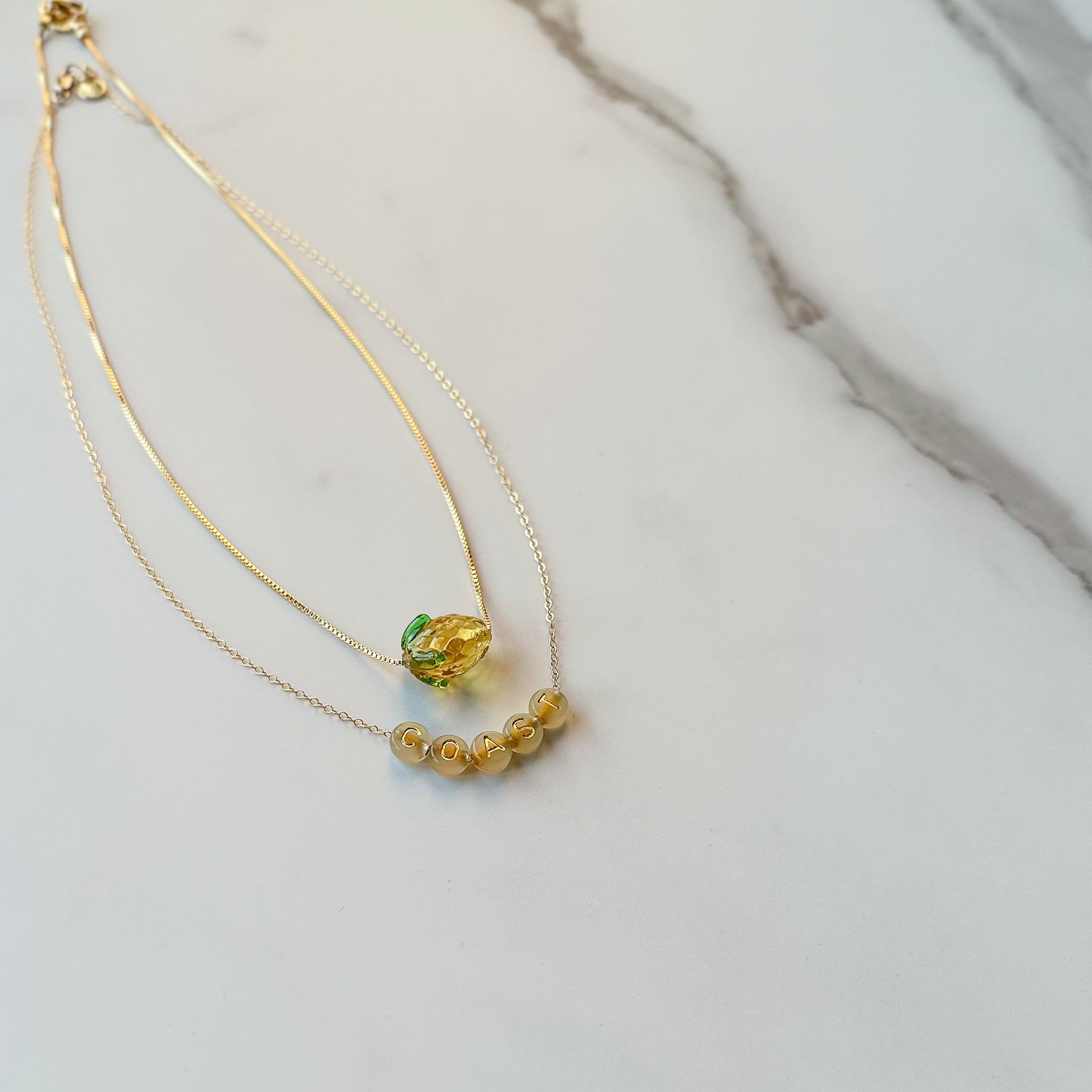 - A duo of gold-filled box and cable chain necklaces decorated with a pineapple charm and glow-in-the-dark letter beads, including the option to personalize with your name for the "Thalassa" style (please indicate the name in the "special instructions" section of shopping cart):