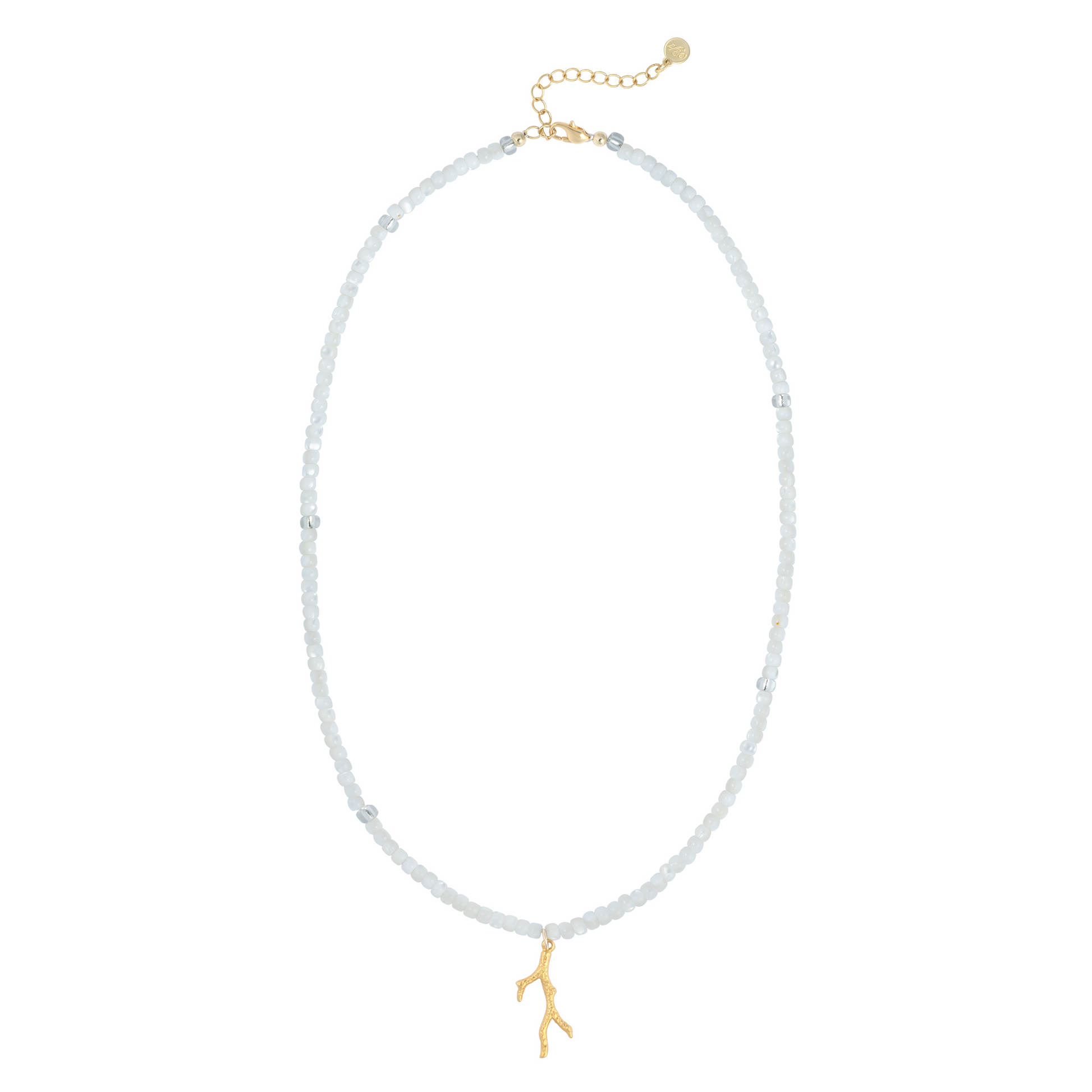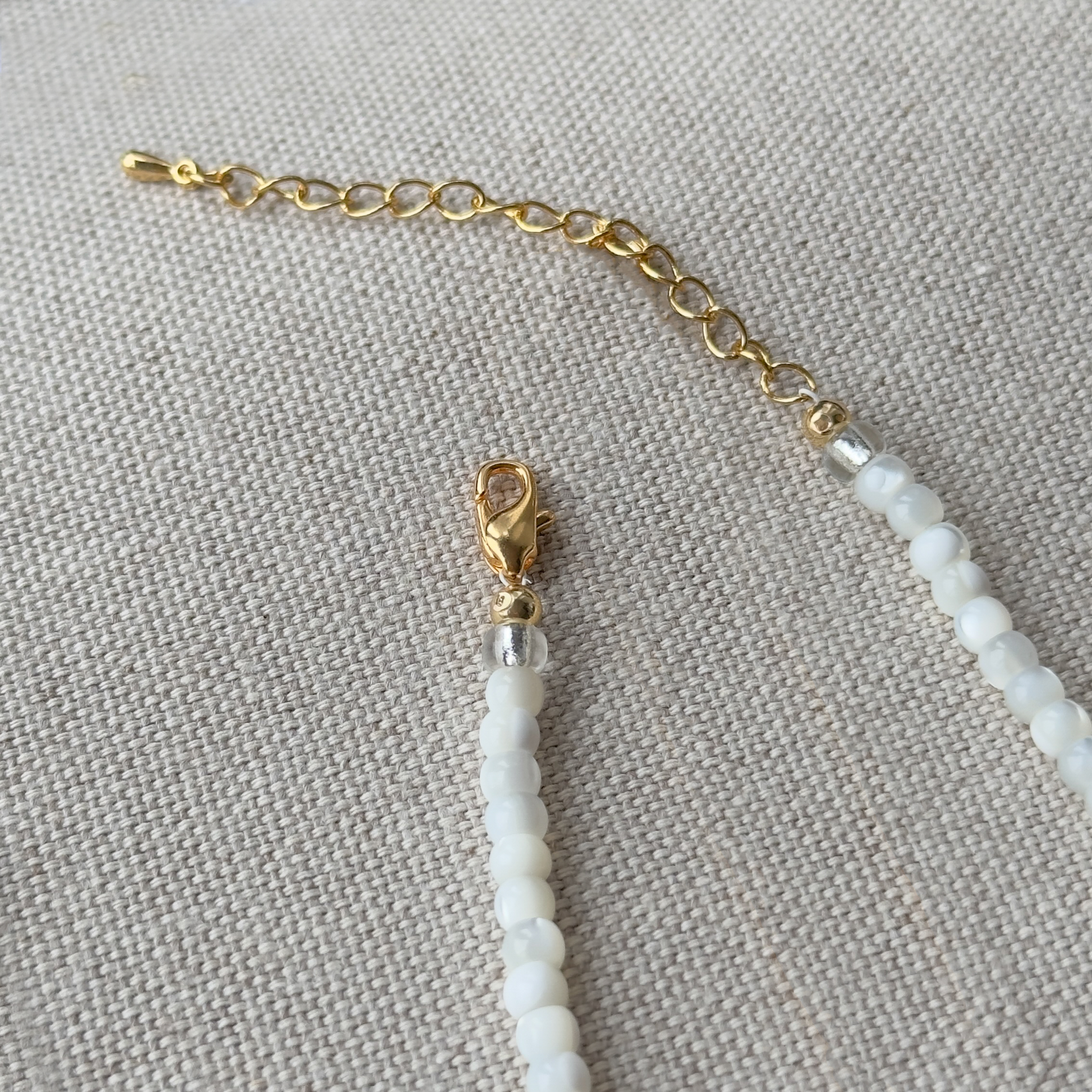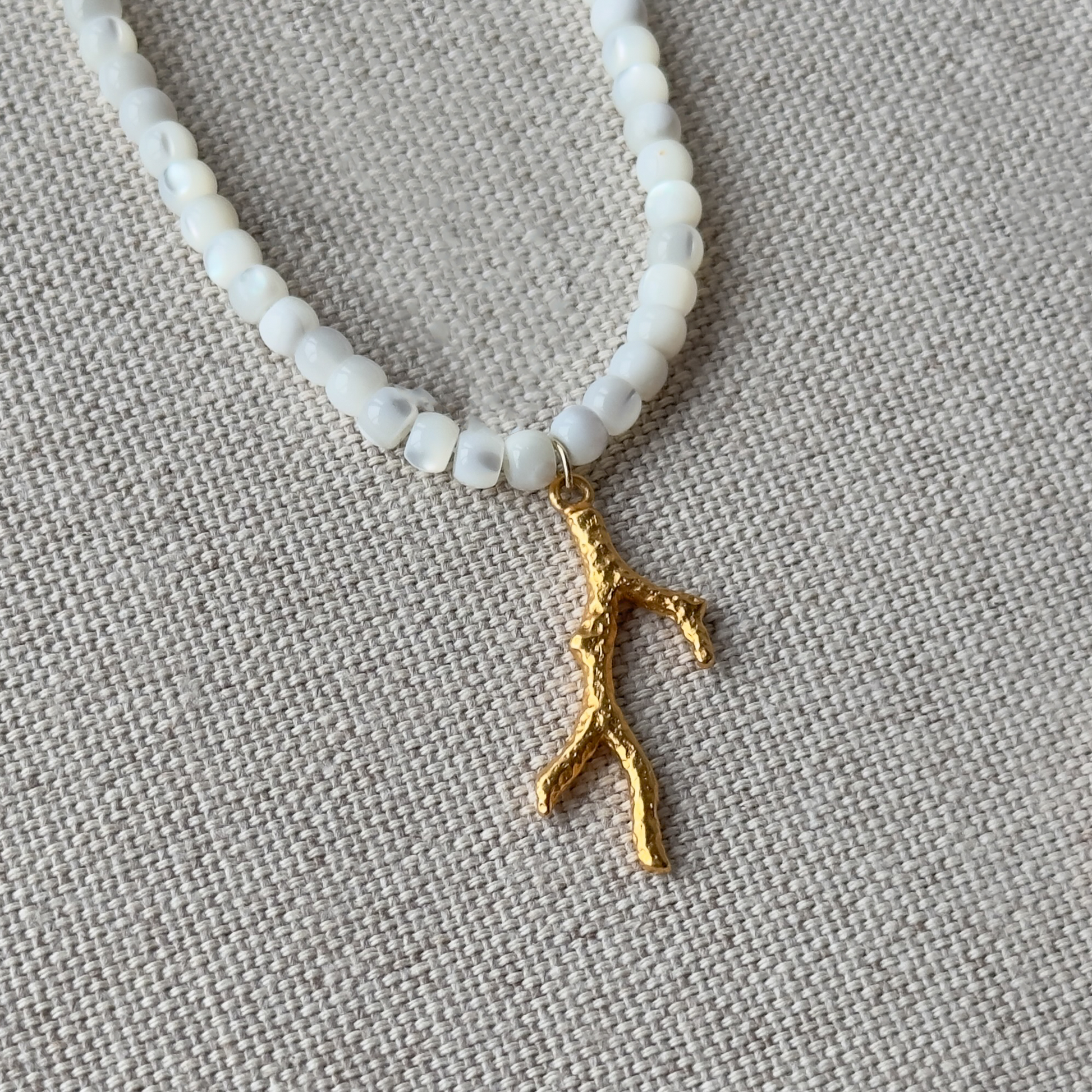 - Materials: Gold plated bronze coral branch charm, mother of pearl beads, Miyuki glass seed beads, gold plated components