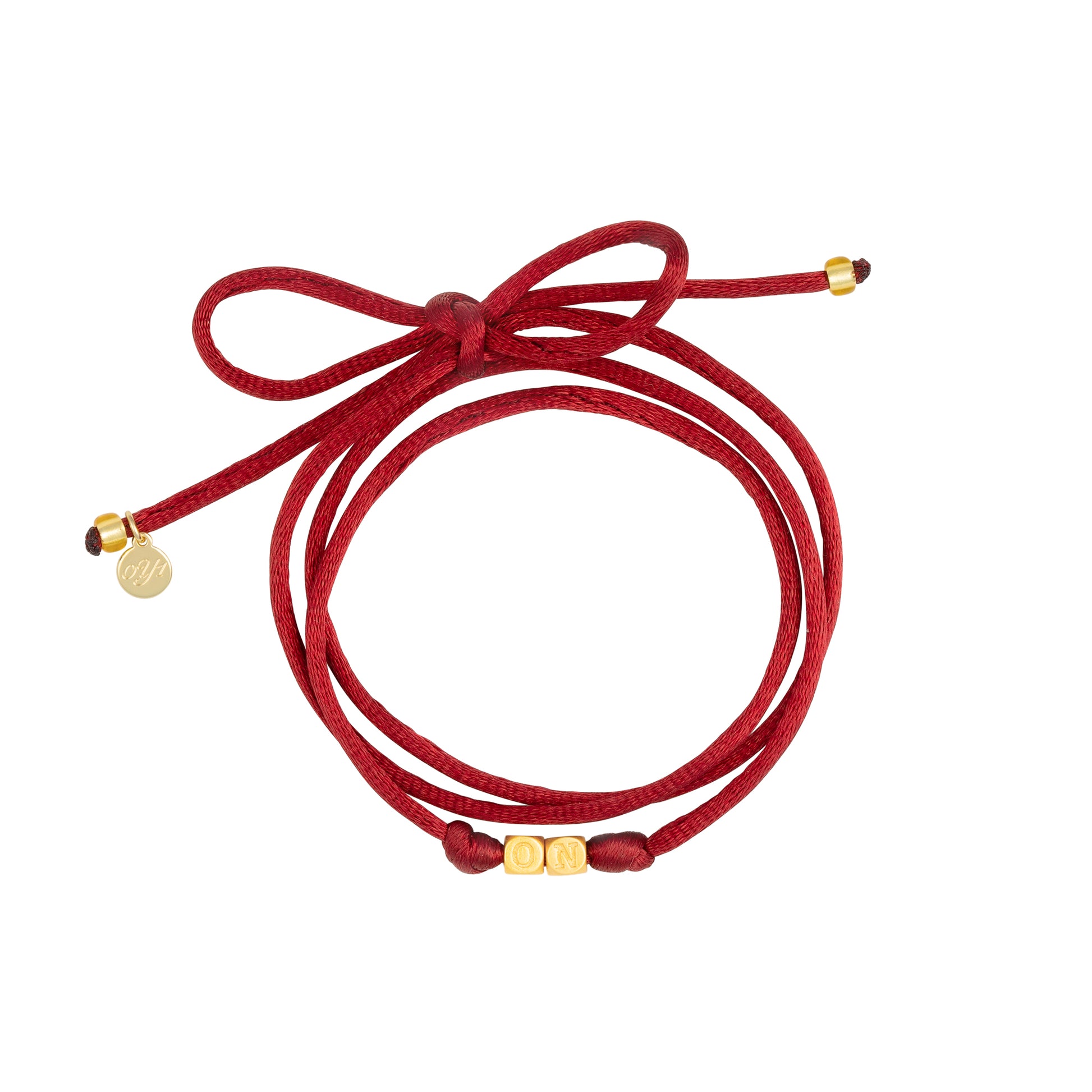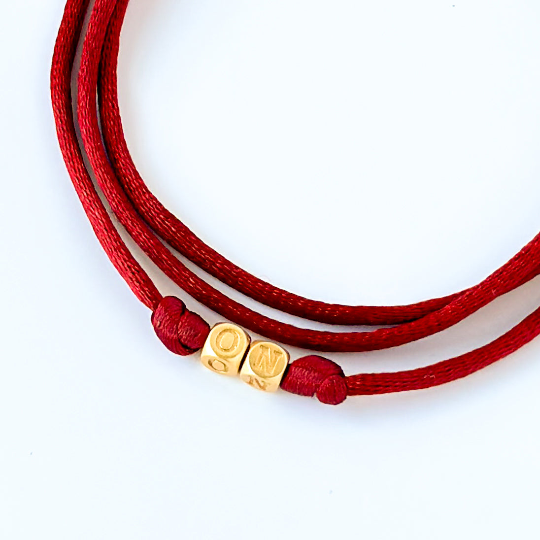 - Materials: Mini brass letter beads, gold Miyuki glass seed beads, satin nylon cord, gold plated component