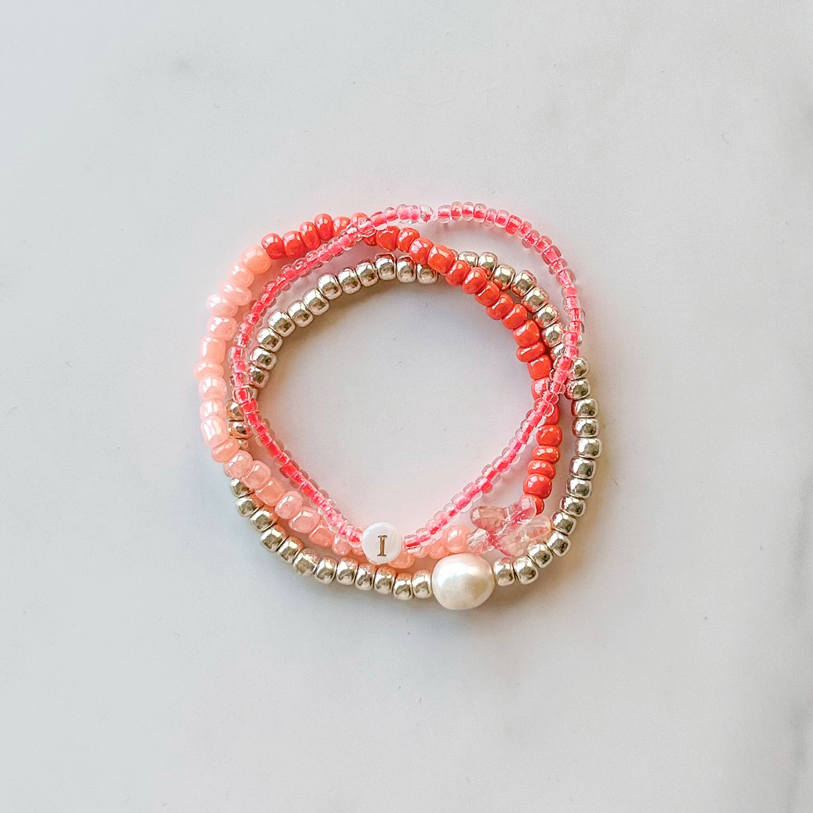 - A bundle of 3 handmade glass beaded stretch bracelets, accented with starfish and freshwater pearl charms, including the option to add a mother of pearl initial bead to the "Ondine" style (please indicate the letter in the "special instructions" section of shopping cart):