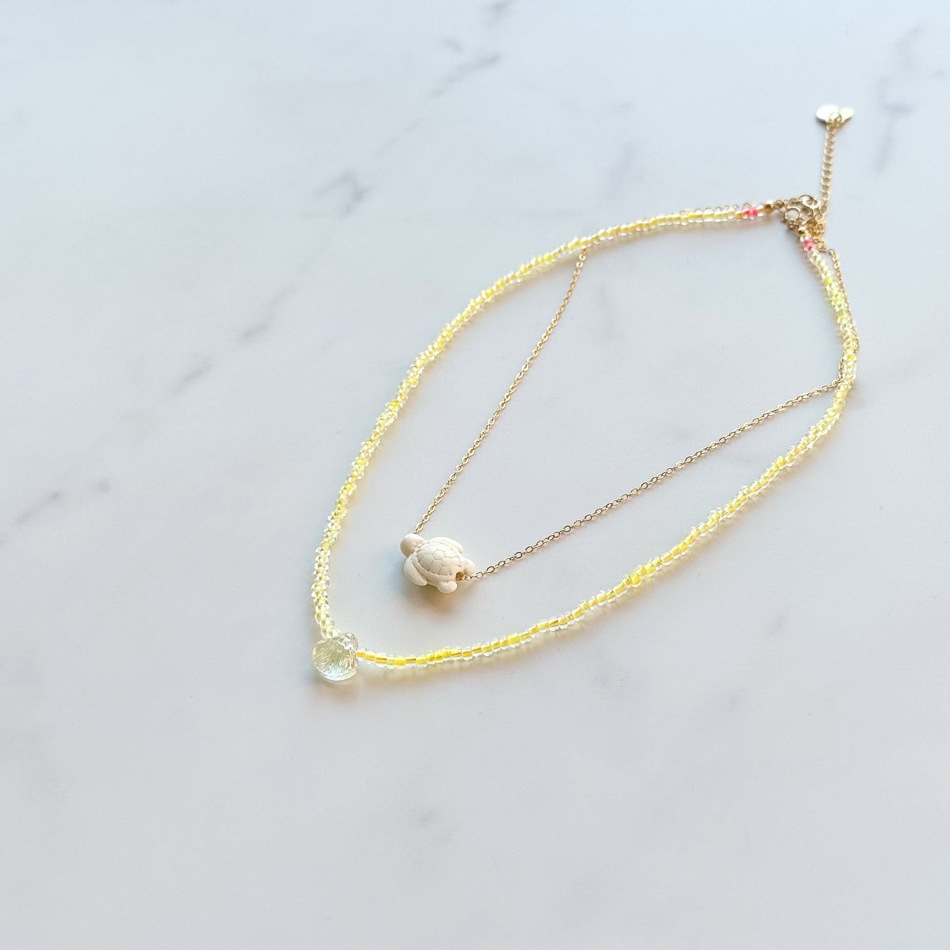 - A duo of gold-filled cable chain and glass seed beaded necklaces decorated with turtle and shell charms: