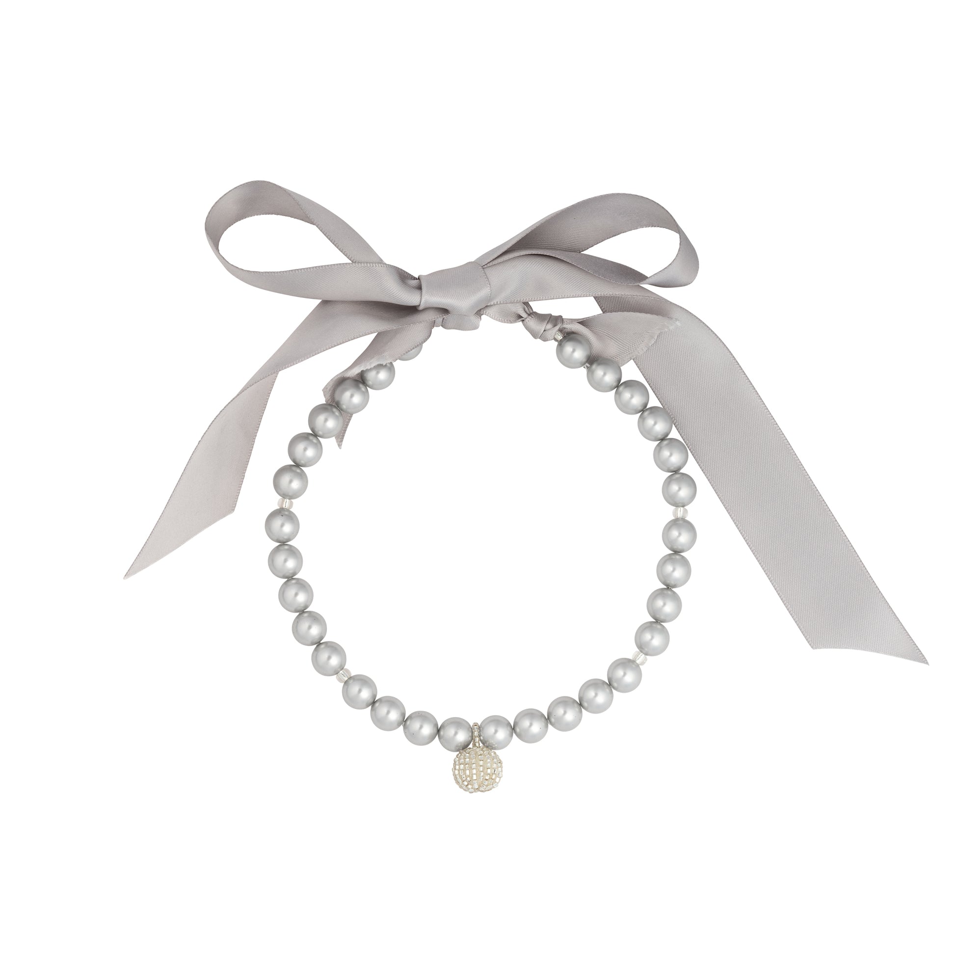 - Materials: Vintage Swarovski glass pearls, silver Miyuki glass seed beads, satin polyester ribbon, vintage beaded ball pendant, gold plated components