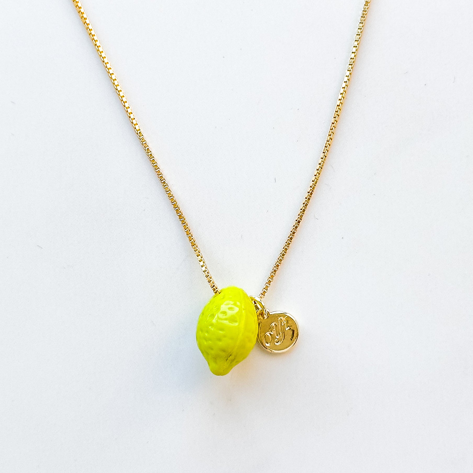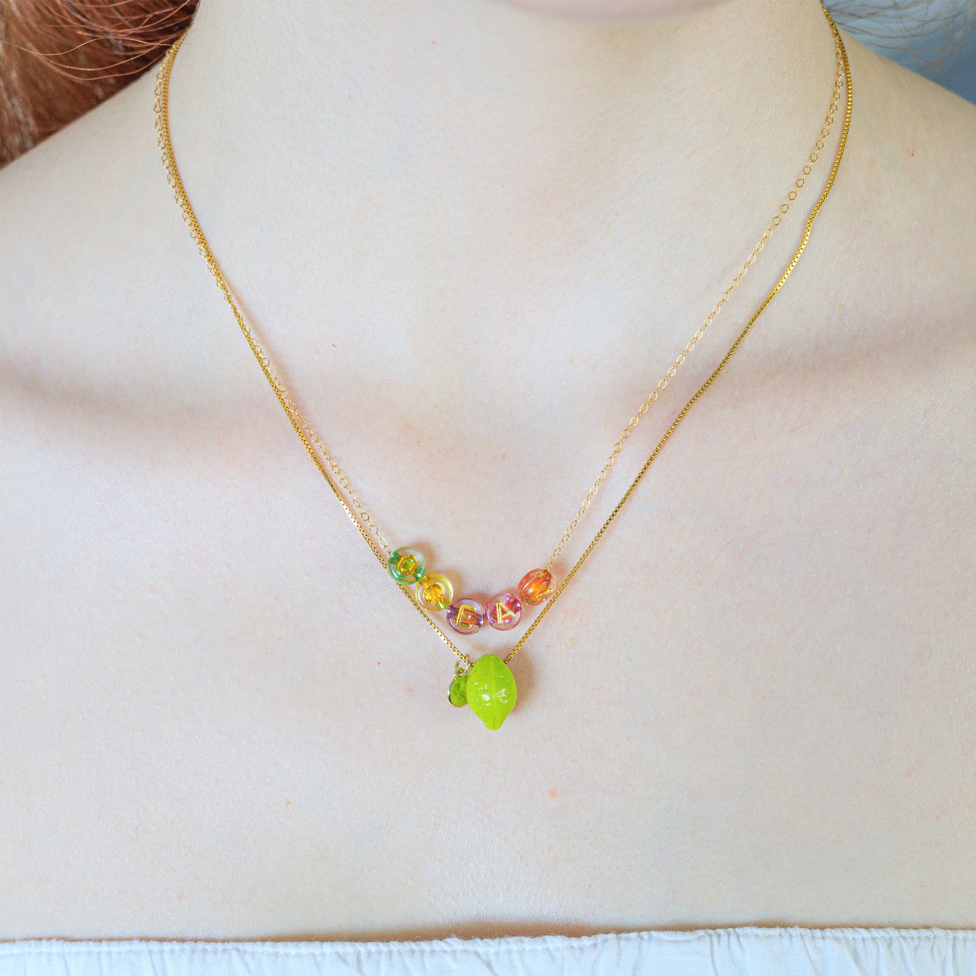 - Gold-filled box chain necklace with a glass citrus fruit charm and logo tag
