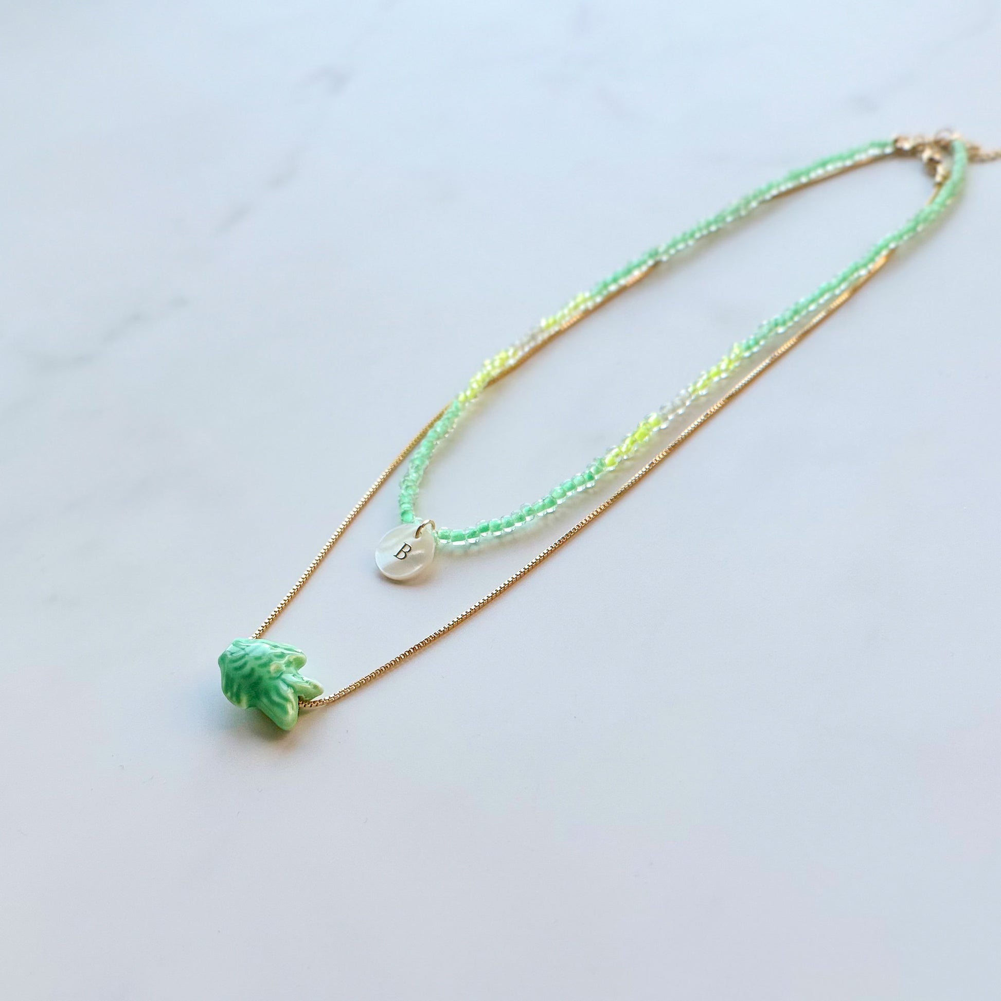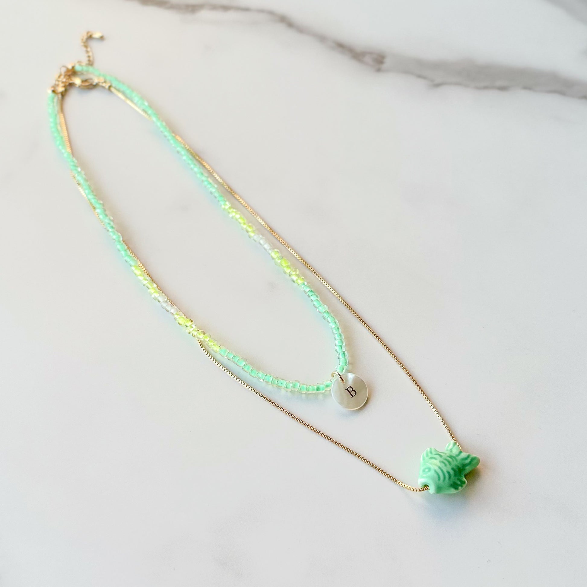 - A duo of gold-filled box chain and glass seed beaded necklaces decorated with a fish charm and the option to add an initial tag to the "Halcyon" style (please indicate the letter in the "special instructions" section of shopping cart):