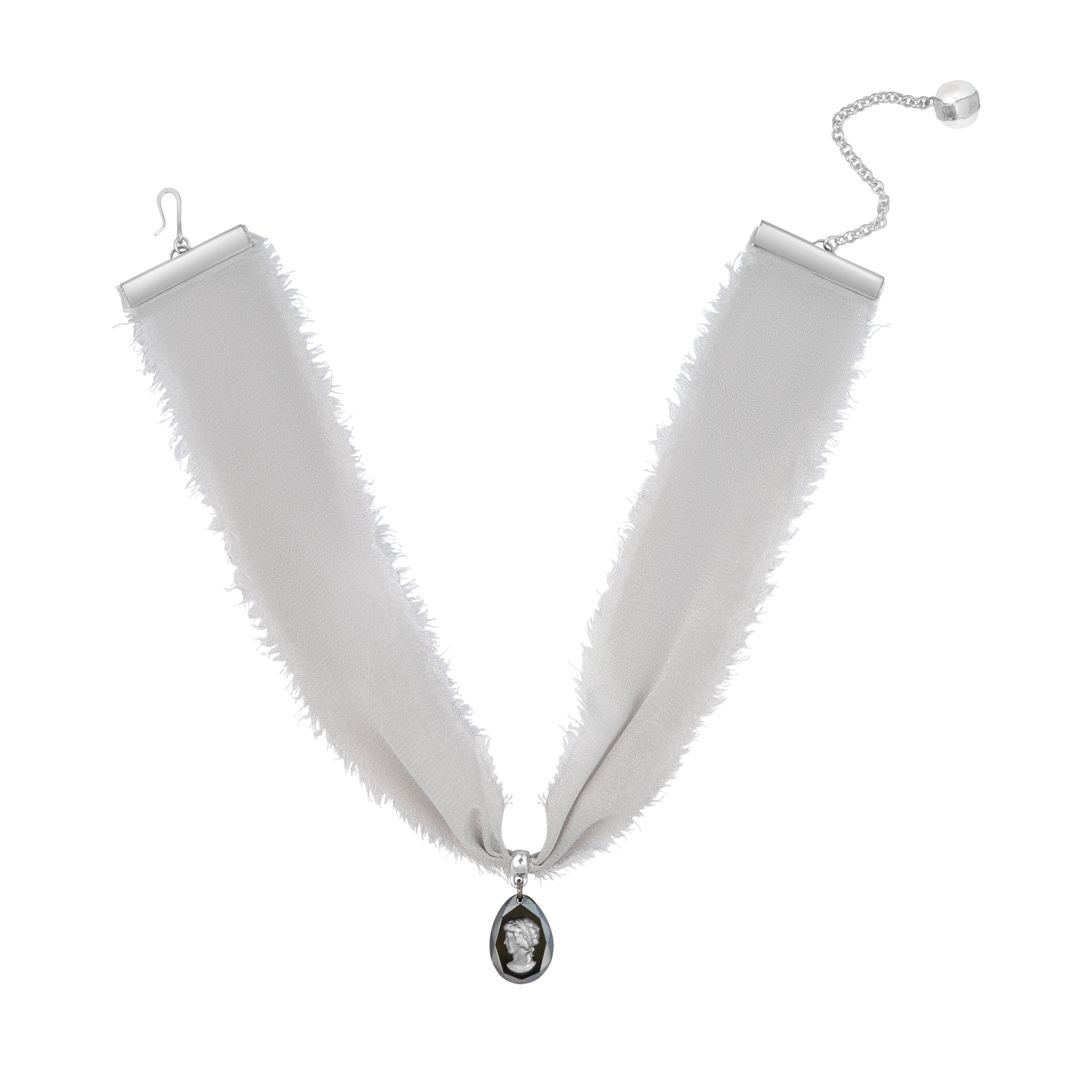 - Materials: Vintage German glass intaglio pendant, silver-gray crepe de chine silk ribbon with frayed edge, banded freshwater pearl end charm, sterling silver and silver plated components